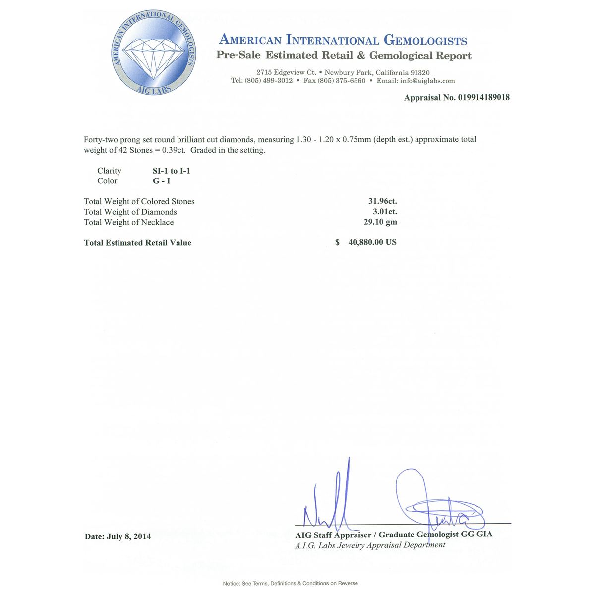 Not all Jewelry, watches or loose stones are appraised and the appraisals are provided for bidders only in certain instances at the discretion of SAA. Our appraisals are conducted by independent third-party appraisal firms. Such firms may be certified GIA Gemologists or have education in the industry or alternative certifications. Appraisals should be used for verification of gemstone and/or metal weight, size, and grade only, not actual value for resale or insurance purposes. Appraisal value should be not considered for actual value, as price varies greatly from retail locations and other merchants in different geographic locations. All Items auctioned by SAA should not be purchased with a view or expectation toward resale for appraisal price given, or to make a profit. The ultimate value for which an item can be resold may vary drastically from the appraisals listed by SAA.