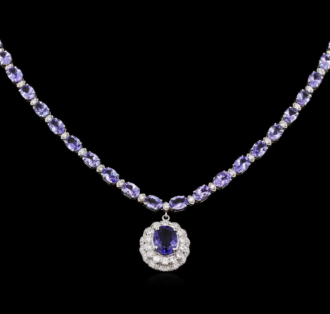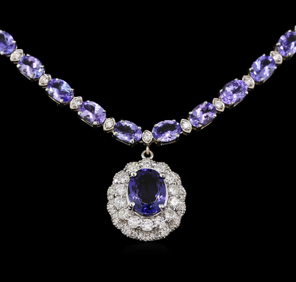 One electronically tested 14KT white gold ladies cast & assembled tanzanite and diamond necklace with a bright polish finish. Seventeen inch length necklace features a tanzanite and diamond pendant supported by a flexible tanzanite and diamond ribbon, terminating in a concealed clasp with safety. Identified with markings of "14K". Condition is new, good workmanship. Containing: One prong set oval mixed cut natural tanzanite, measuring 10.80 x 8.60 x 5.00.mm, 6%. bulge factor, approximate weight of 3.34ct., clarity is eye clean, type I, medium dark, very slightly grayish, violetish blue color, (GIA vB 6/3), cut is good. Transmitting light with no distortion, transparent. Graded in the setting. Forty-six prong set oval mixed cut natural tanzanites, measuring 6.50 x 5.00. x 2.80mm, approximate total weight of 28.62ct., clarity is eye clean, type I, medium dark, very slightly grayish, bluish violet color, (GIA bV 6/3), cut is good. Transmitting light with no distortion, transparent. Measurements & the color grade are an average for the group. Graded in the setting. Tanzanite is a very rare gemstone that is only found in the country of Tanzania. Originally discovered in 1967. Tiffany & Company, named the stone Tanzanite. It is found in the Usumburu Mountains that border the Umba Valley of northern Tanzania. Tanzanite occurs in gray, brown, violet, blue, reddish-purple, & green. The gem is interesting because of its exceptional pleochroism. Rotated in different directions a tanzanite will exhibit multiple changes of color. Tanzanite has a low tolerance to ultrasonic cleaning, and should not be cleaned using this method. Fourteen prong set round brilliant cut diamonds, measuring 2.90 - 2.80 x 1.71mm (depth est.) approximate total weight of 14 Stones = 1.28ct. Graded in the setting. Clarity: SI-1 to I-1 . Color: G - I Forty-Six prong set round brilliant cut diamonds, measuring 2.00. - 1.90 x 1.17mm (depth est.) approximate total weight of 46 Stones = 1.34ct. Graded in the setting. Clarity: SI-1 to I-1 . Color: G - I Forty-Two prong set round brilliant cut diamonds, measuring 1.30 - 1.20 x 0.75mm (depth est.) approximate total weight of 42 Stones = 0.39ct. Graded in the setting. Clarity: SI-1 to I-1 . Color: G - I. Total Weight of Colored Stones 31.96ct. Total Weight of Diamonds 3.01ct. Total Weight of Necklace 29.10 grams. AIG Appraised at $40,880.00.