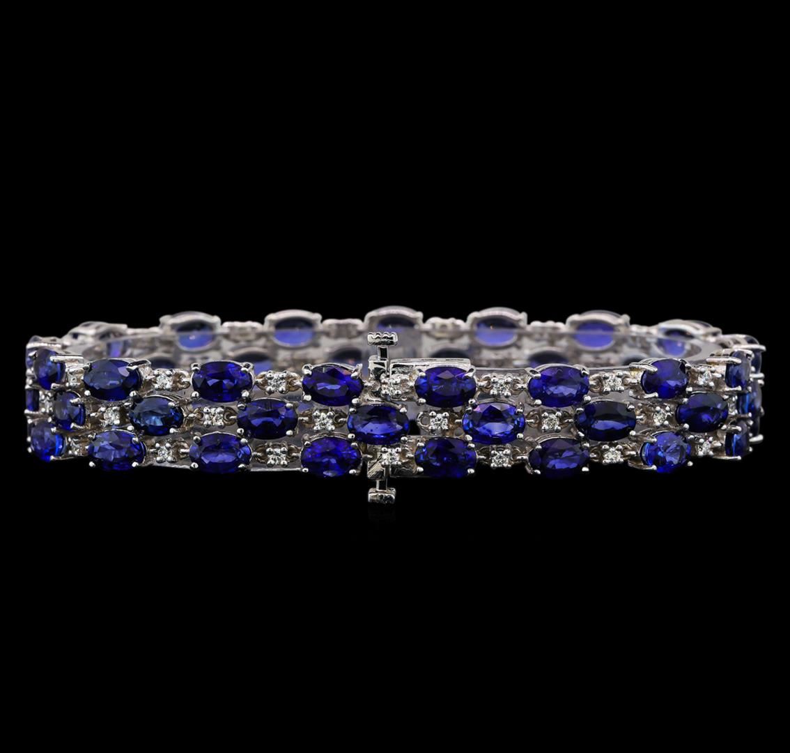 One electronically tested 14KT white gold ladies combination cast & assembled sapphire and diamond bracelet with a double tongue clasp with a bright polish finish. Bracelet measures 7-1/8" in length and 3/8" width. Condition is new. Containing: Fifty-one prong set oval modified brilliant cut natural blue sapphires, measuring 6.40 x 4.20 x 2.73mm, exact total weight 32.00ct., clarity is eye clean, type II, medium, moderately strong, blue color, (GIA B 5/4), cut is good. Fifty-One prong set round brilliant cut diamonds, measuring 1.90 - 1.60 x 1.05mm (depth est.) exact total weight 51 Stones = 0.94ct. Clarity: VS-2 to SI-1. Color: H - I, Cut is Good. All diamonds and colored gemstones are graded in the mounting, unless otherwise stated. Colored gemstones are presumed to have been subjected to commonly used enhancement processes.. Total Weight of Colored Stones 32.00ct. Total Weight of Diamonds 0.94ct. Total Weight of Bracelet 27.10 grams. GGL Appraised at $7,340.00.