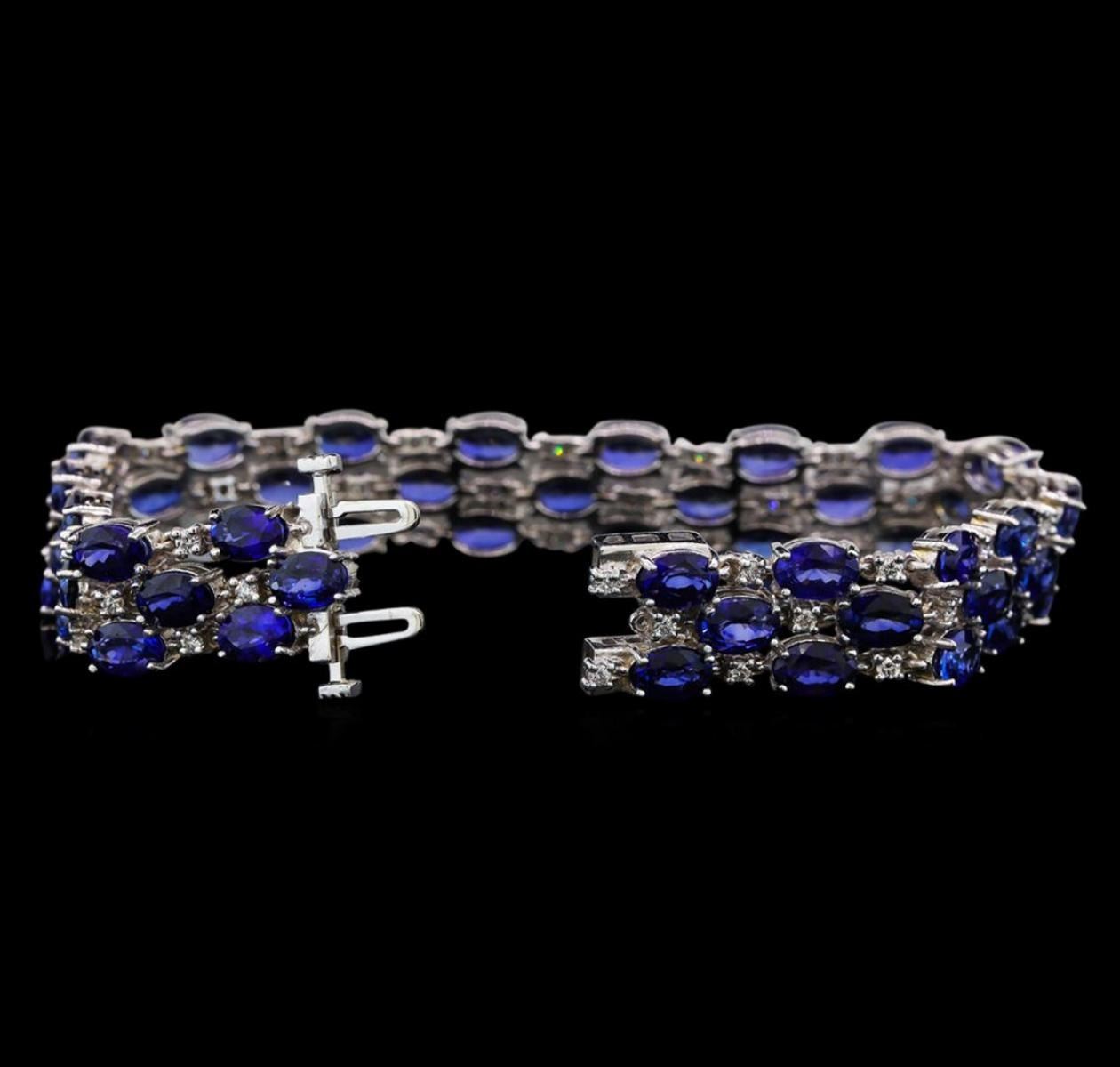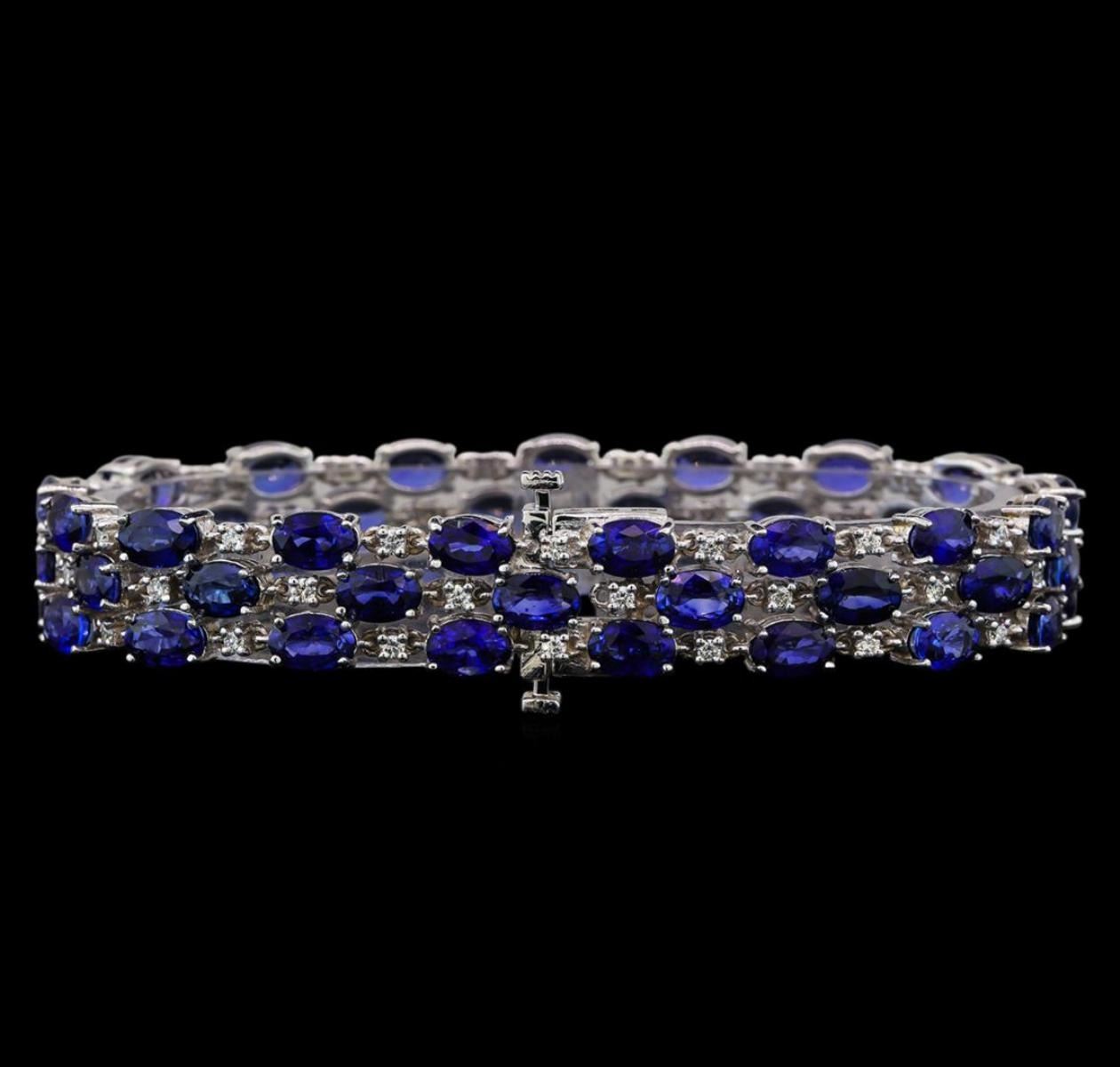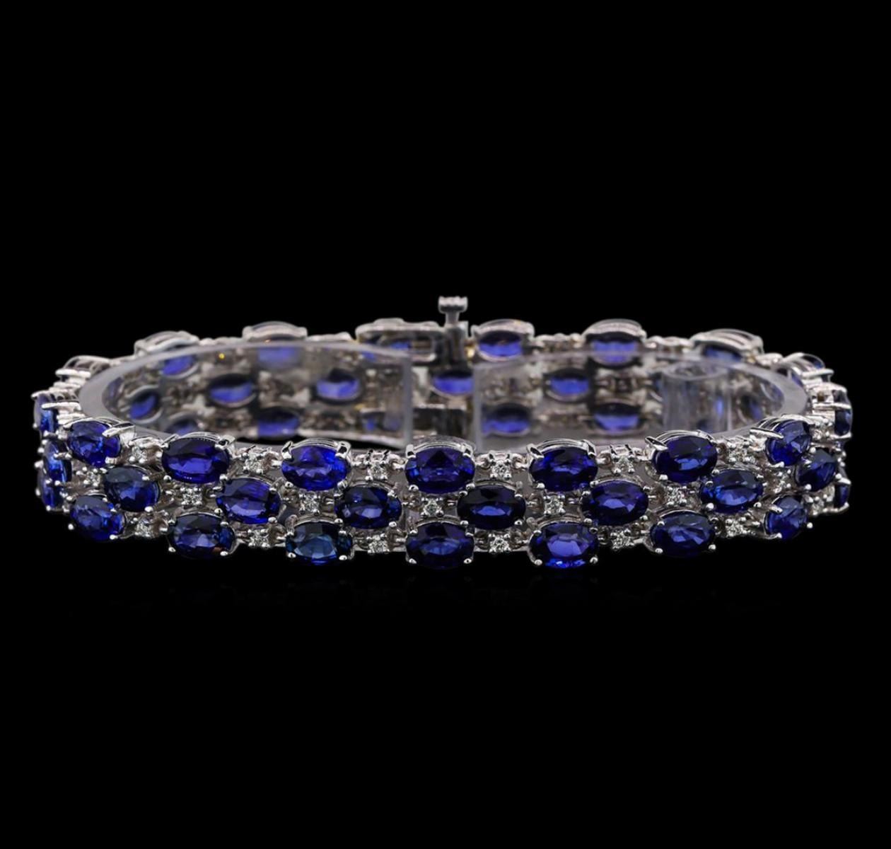 One electronically tested 14KT white gold ladies combination cast & assembled sapphire and diamond bracelet with a double tongue clasp with a bright polish finish. Bracelet measures 7-1/8" in length and 3/8" width. Condition is new. Containing: Fifty-one prong set oval modified brilliant cut natural blue sapphires, measuring 6.40 x 4.20 x 2.73mm, exact total weight 32.00 ct., clarity is eye clean, type II, medium, moderately strong, blue color, (GIA B 5/4), cut is good. Fifty-One prong set round brilliant cut diamonds, measuring 1.90 - 1.60 x 1.05mm (depth est.) exact total weight 51 Stones = 0.94ct. Clarity: VS-2 to SI-1. Color: H - I, Cut is Good. All diamonds and colored gemstones are graded in the mounting, unless otherwise stated. Colored gemstones are presumed to have been subjected to commonly used enhancement processes.. Total Weight of Colored Stones 32.00 ct. Total Weight of Diamonds 0.94ct. Total Weight of Bracelet 27.10 grams. GGL Appraised.