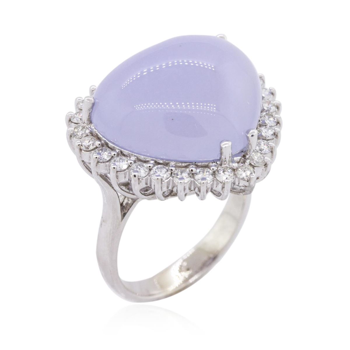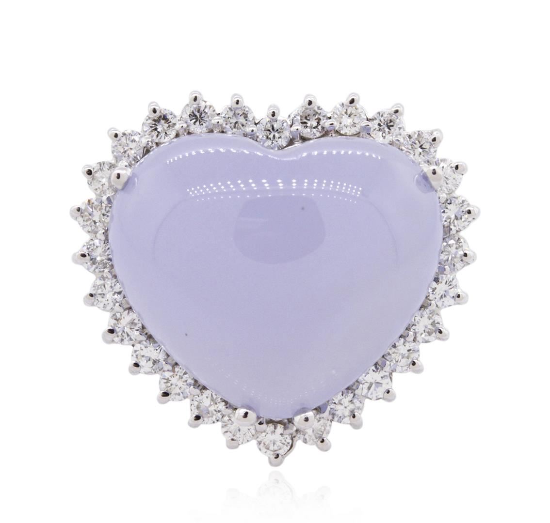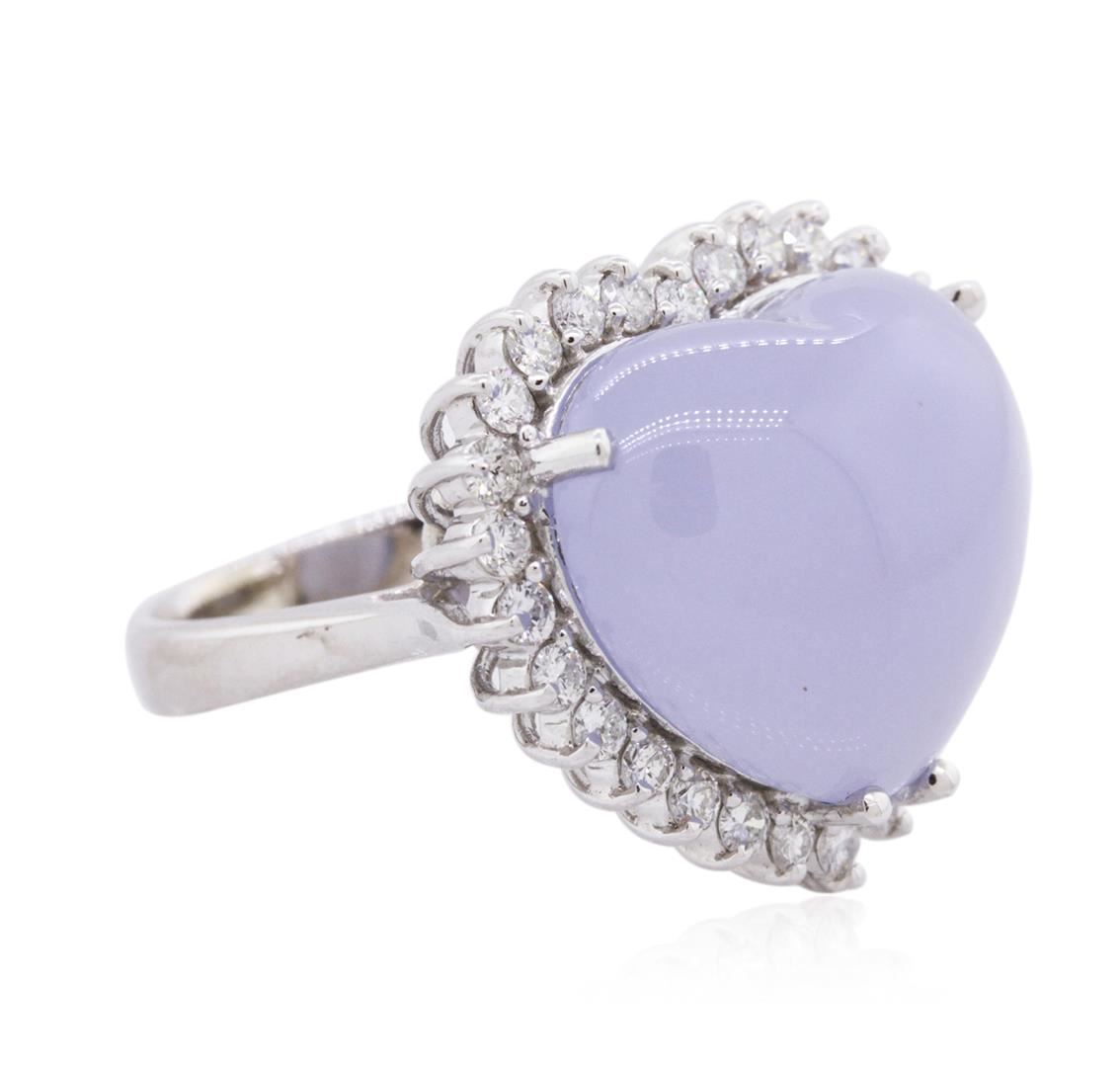 One electronically tested 14KT white gold ladies cast chalcedony and diamond ring with a bright polish finish. Identified with markings of "14K". Condition is new. Containing: One prong set heart cabochon cut natural agate, measuring 29.80 x 16.40 x 9.50mm, approximate weight of 32.59ct., clarity is severely included, medium light, very slightly grayish, violet color, (GIA V 4/3), cut is good. Twenty-Eight prong set round brilliant cut diamonds, measuring 1.80 - 1.80 x 1.08mm (depth est.) approximate total weight of 28 Stones = 0.60ct. Clarity: SI-2. Color: J, Cut is Good. Colored gemstones are presumed to have been subjected to commonly used enhancement processes. All diamonds and colored gemstones are graded in the mounting, unless otherwise stated. Total Weight of Colored Stones 32.59ct. Total Weight of Diamonds 0.60ct. Total Weight of Ring 11.80 grams. GGL Appraised at $4,050.00.