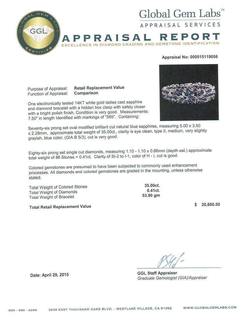 One electronically tested 14KT white gold ladies cast sapphire and diamond bracelet with a hidden box clasp with safety closer with a bright polish finish. Measurements: 7.50" in length Identified with markings of "585". Condition is very good. Containing: Seventy-six prong set oval modified brilliant cut natural blue sapphires, measuring 5.00 x 3.50 x 2.28mm, approximate total weight of 35.00ct., clarity is eye clean, type II, medium, very slightly grayish, blue color, (GIA B 5/3), cut is very good. Eighty-Six prong set single cut diamonds, measuring 1.10 - 1.10 x 0.66mm (depth est.) approximate total weight of 86 Stones = 0.41ct. Clarity: SI-2 to I-1. Color: H - I, Cut is Good. Colored gemstones are presumed to have been subjected to commonly used enhancement processes. All diamonds and colored gemstones are graded in the mounting, unless otherwise stated. Total Weight of Colored Stones 35.00ct. Total Weight of Diamonds 0.41ct. Total Weight of Bracelet 53.90 grams. GGL Appraised at $20,600.00.