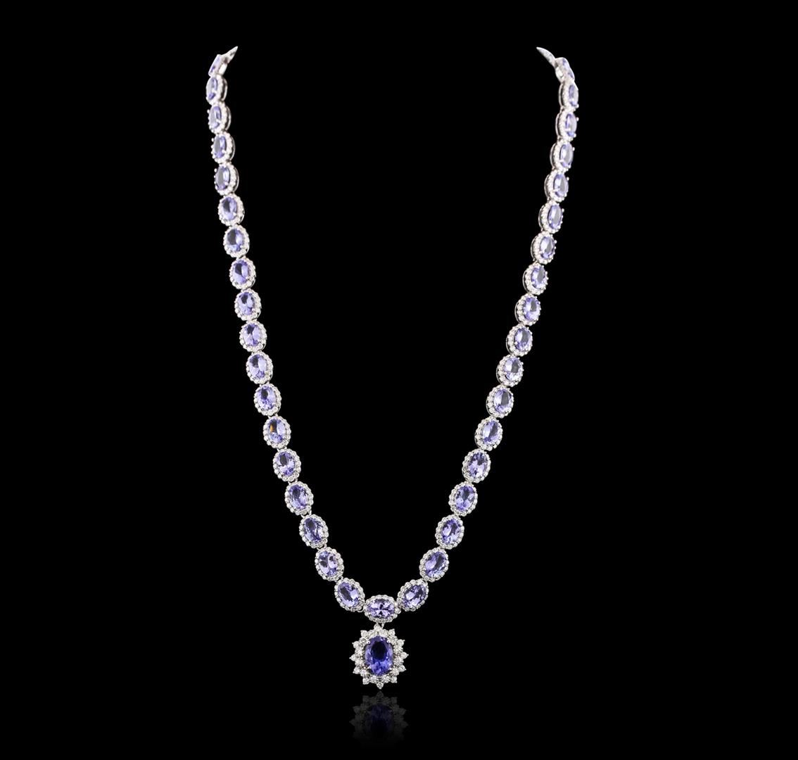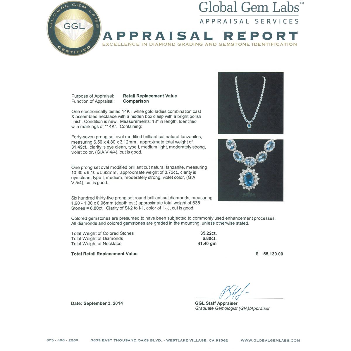 One electronically tested 14KT white gold ladies combination cast & assembled necklace with a hidden box clasp with a bright polish finish. Measurements: 18" in length. Identified with markings of "14K". Condition is new. Containing: Forty-seven prong set oval modified brilliant cut natural tanzanites, measuring 6.50 x 4.80 x 3.12mm, approximate total weight of 31.49ct., clarity is eye clean, type I, medium light, moderately strong, violet color, (GIA V 4/4), cut is good. One prong set oval modified brilliant cut natural tanzanite, measuring 10.30 x 9.10 x 5.92mm, approximate weight of 3.73ct., clarity is eye clean, type I, medium, moderately strong, violet color, (GIA V 5/4), cut is good. Six Hundred Thirty-Five prong set round brilliant cut diamonds, measuring 1.90 - 1.30 x 0.96mm (depth est.) approximate total weight of 635 Stones = 6.80ct. Clarity: SI-2 to I-1. Color: I - J, Cut is Good. Colored gemstones are presumed to have been subjected to commonly used enhancement processes. All diamonds and colored gemstones are graded in the mounting, unless otherwise stated. Total Weight of Colored Stones 35.22ct. Total Weight of Diamonds 6.80ct. Total Weight of Necklace 41.40 grams. GGL Appraised at $55,130.00.