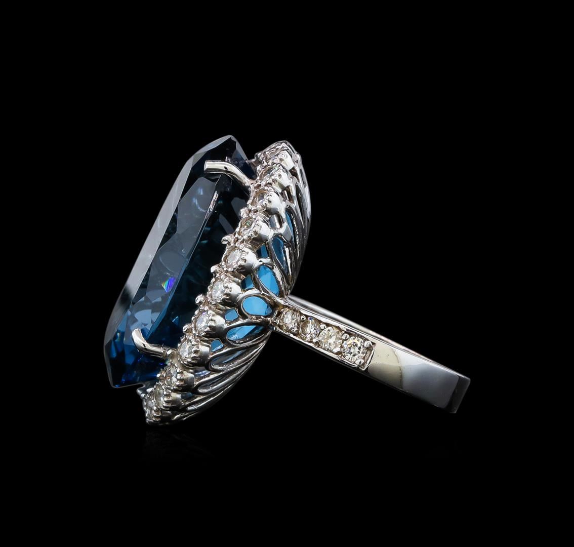 One electronically tested 14KT white gold ladies cast topaz and diamond ring with a bright polish finish. Identified with markings of "14K". Condition is new. Containing: One prong set oval modified brilliant cut natural blue topaz, measuring 23.96 x 17.63 x 11.46mm, approximate weight of 35.89ct., clarity is eye clean, type I, medium, very slightly grayish, very slightly greenish blue color, (GIA vslgB 5/3), cut is good. Thirty-Two prong set round brilliant cut diamonds, measuring 1.80 - 1.80 x 1.08mm (depth est.) approximate total weight of 32 Stones = 1.23ct. Clarity: SI-1 to SI-2. Color: H - I, Cut is Good. Colored gemstones are presumed to have been subjected to commonly used enhancement processes. All diamonds and colored gemstones are graded in the mounting, unless otherwise stated. Total Weight of Colored Stones 35.89ct. Total Weight of Diamonds 1.23ct. Total Weight of Ring 14.36 grams. GGL Appraised at $4,865.00.