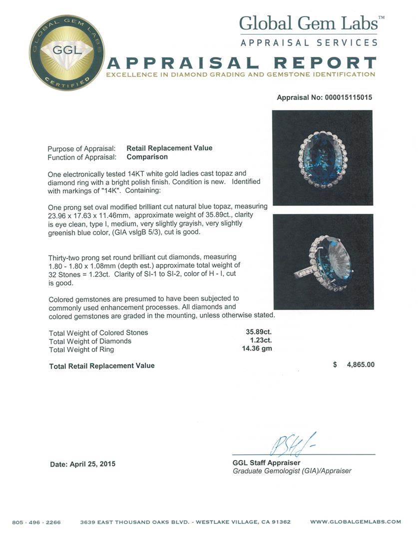 One electronically tested 14KT white gold ladies cast topaz and diamond ring with a bright polish finish. Identified with markings of "14K". Condition is new. Containing: One prong set oval modified brilliant cut natural blue topaz, measuring 23.96 x 17.63 x 11.46mm, approximate weight of 35.89ct., clarity is eye clean, type I, medium, very slightly grayish, very slightly greenish blue color, (GIA vslgB 5/3), cut is good. Thirty-Two prong set round brilliant cut diamonds, measuring 1.80 - 1.80 x 1.08mm (depth est.) approximate total weight of 32 Stones = 1.23ct. Clarity: SI-1 to SI-2. Color: H - I, Cut is Good. Colored gemstones are presumed to have been subjected to commonly used enhancement processes. All diamonds and colored gemstones are graded in the mounting, unless otherwise stated. Total Weight of Colored Stones 35.89ct. Total Weight of Diamonds 1.23ct. Total Weight of Ring 14.36 grams. GGL Appraised at $4,865.00.