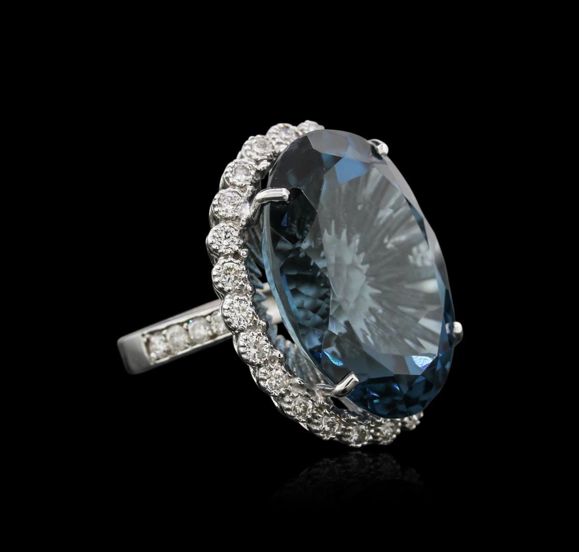 One electronically tested 14KT white gold ladies cast topaz and diamond ring with a bright polish finish. Identified with markings of "14K". Condition is new. Containing: One prong set oval modified brilliant cut natural blue topaz, measuring 23.96 x 17.63 x 11.46mm, approximate weight of 35.89ct., clarity is eye clean, type I, medium, very slightly grayish, very slightly greenish blue color, (GIA vslgB 5/3), cut is good. Thirty-Two prong set round brilliant cut diamonds, measuring 1.80 - 1.80 x 1.08mm (depth est.) approximate total weight of 32 Stones = 1.23ct. Clarity: SI-1 to SI-2. Color: H - I, Cut is Good. Colored gemstones are presumed to have been subjected to commonly used enhancement processes. All diamonds and colored gemstones are graded in the mounting, unless otherwise stated. Total Weight of Colored Stones 35.89ct. Total Weight of Diamonds 1.23ct. Total Weight of Ring 14.36 grams. GGL Appraised at $4,865.00.