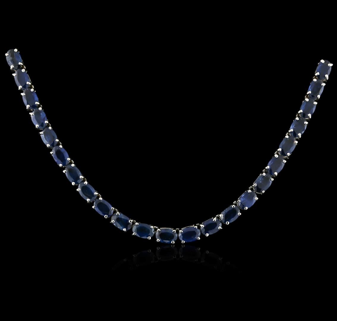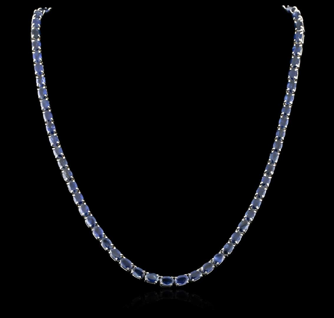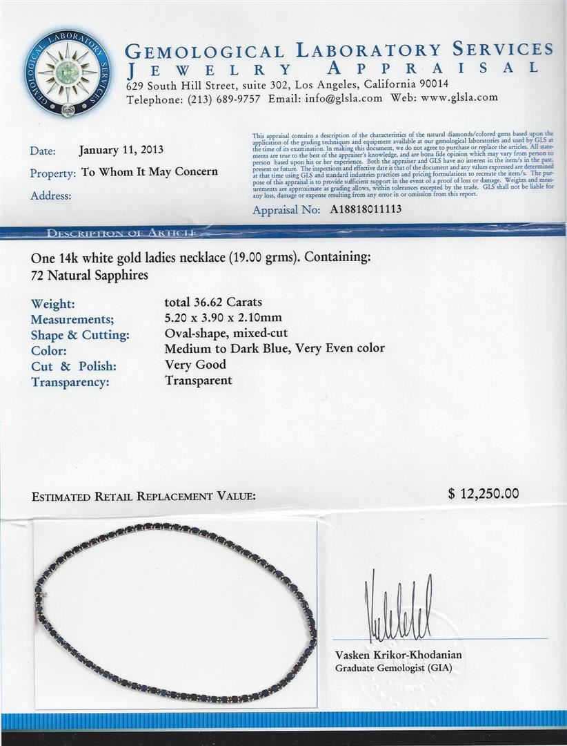 One necklace featuring: 14KT white gold weighing 19.00 grams containing 72 blue sapphires with a total weight of 36.62ct. Measurements: 5.20 x 3.90 x 2.10mm. Shape & Cutting: Oval-shape, mixed-cut. Color: Medium to Dark Blue, Very Even color. Cut & Polish: Very Good. Transparency: Transparent. GLS Appraised at $12,250.00.