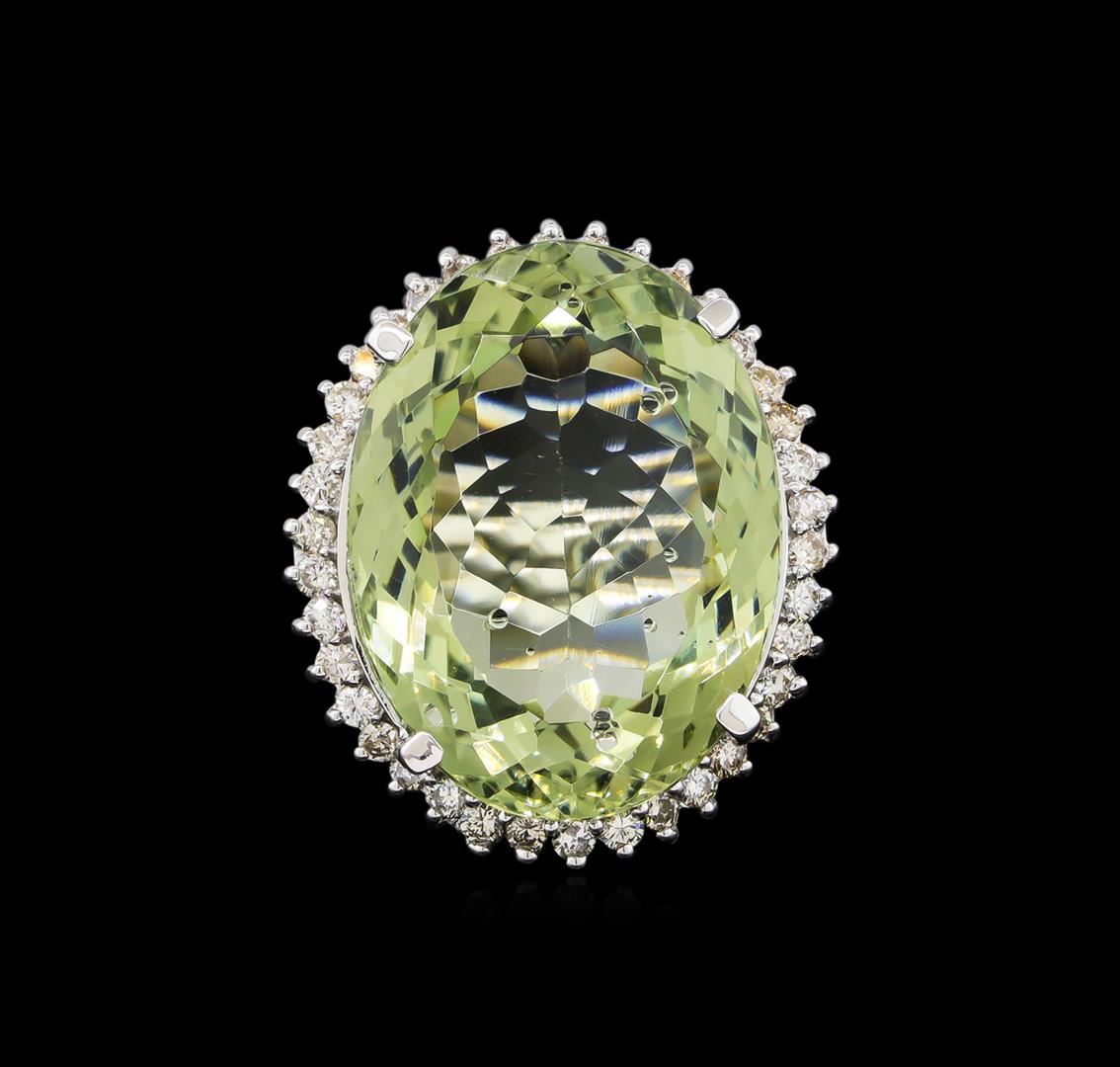 One electronically tested 14KT white gold ladies cast green quartz and diamond ring with a bright polish finish. Condition is new, good workmanship. The featured green quartz is set within a stylized diamond bezel, completed by a three millimeter wide band. Identified with markings of "K14". Containing: One prong set oval mixed cut natural green quartz, measuring 27.00 x 20.00 x 11.65mm, 10%. bulge factor, approximate weight of 37.65ct., clarity is eye clean, medium, very slightly grayish, slightly yellowish green color, (GIA slyG 5/3), cut is good. Transmitting light with no distortion, transparent. Graded in the setting. Thirty-Eight prong set round brilliant cut diamonds, measuring 2.20 - 2.00 x 1.26mm (depth est.) approximate. Total Weight of 38 Stones = 1.38ct. Graded in the setting. Clarity: SI-1 to I-1. Color: H - J. Total Weight of Colored Stones 37.65ct. Total Weight of Diamonds 1.38ct. Total Weight of Ring 20.61 grams. AIG Appraised at $7,470.00.