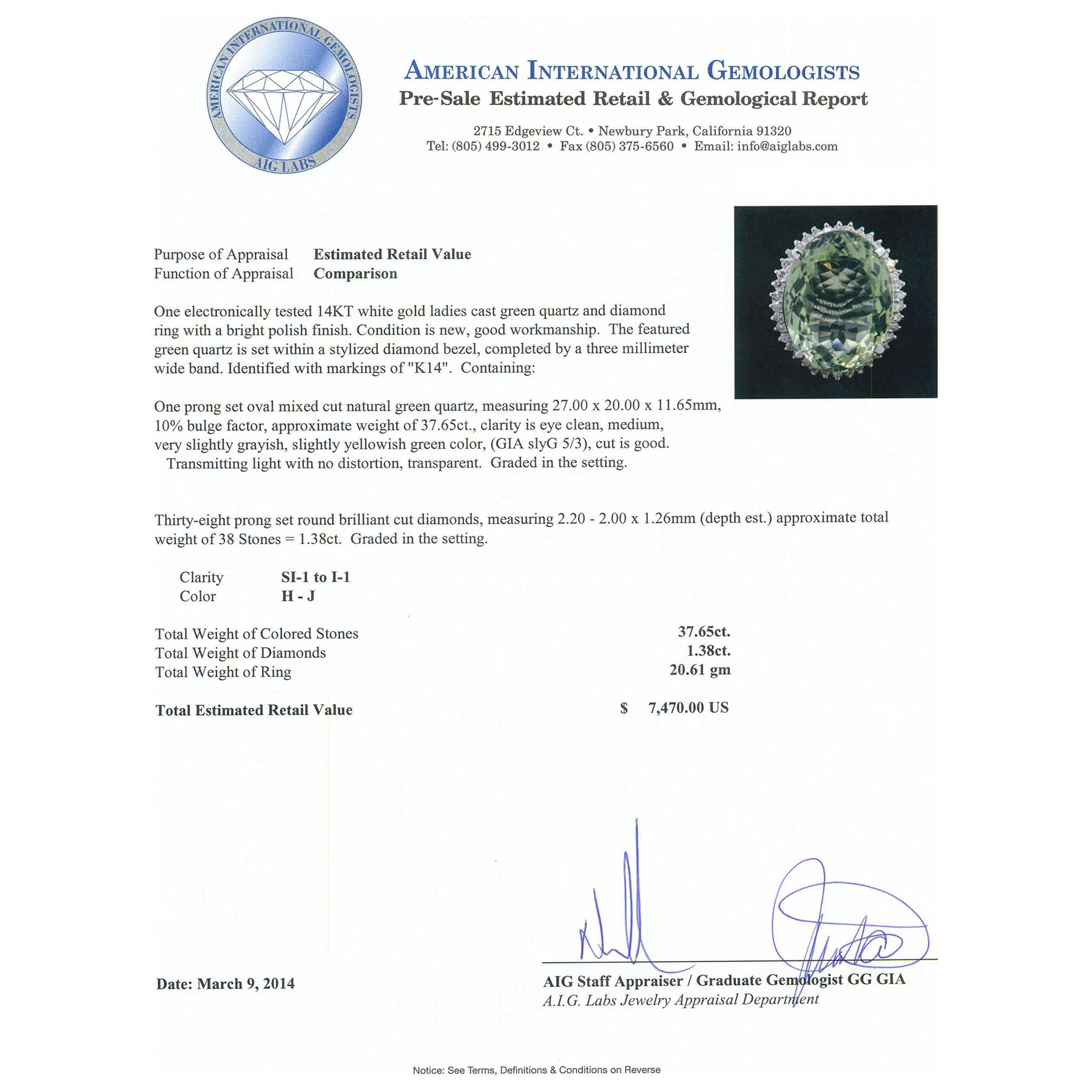 One electronically tested 14KT white gold ladies cast green quartz and diamond ring with a bright polish finish. Condition is new, good workmanship. The featured green quartz is set within a stylized diamond bezel, completed by a three millimeter wide band. Identified with markings of "K14". Containing: One prong set oval mixed cut natural green quartz, measuring 27.00 x 20.00 x 11.65mm, 10%. bulge factor, approximate weight of 37.65ct., clarity is eye clean, medium, very slightly grayish, slightly yellowish green color, (GIA slyG 5/3), cut is good. Transmitting light with no distortion, transparent. Graded in the setting. Thirty-Eight prong set round brilliant cut diamonds, measuring 2.20 - 2.00 x 1.26mm (depth est.) approximate. Total Weight of 38 Stones = 1.38ct. Graded in the setting. Clarity: SI-1 to I-1. Color: H - J. Total Weight of Colored Stones 37.65ct. Total Weight of Diamonds 1.38ct. Total Weight of Ring 20.61 grams. AIG Appraised.
