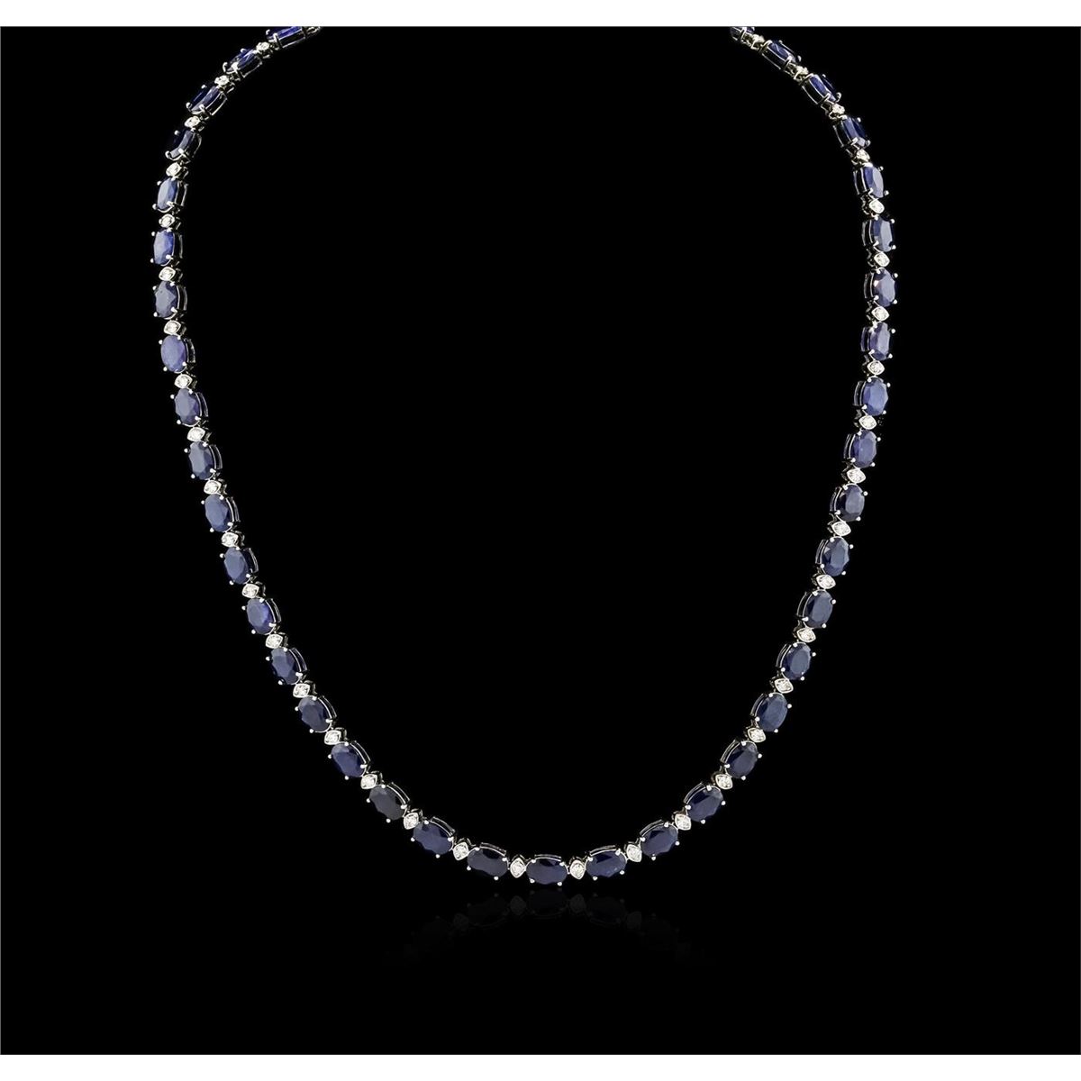 One electronically tested 14KT white gold ladies cast & assembled sapphire and diamond necklace with a bright polish finish. Eighteen and one-half inch length necklace features a flexible sapphire and diamond ribbon, terminating in a concealed clasp with safety. Bright polish finish. Identified with markings of "K14". Condition is new, good workmanship. Containing: Forty-six prong set oval mixed cut natural blue sapphires, measuring 7.00 x 5.00 x 2.70mm, 6% bulge factor, approximate total weight of 37.72ct., clarity is heavily included, type II, dark, very slightly grayish, violetish blue color, (GIA vB 7/3), cut is good. Transmitting light somewhat diffusely, transparent to translucent. Naturally occurring internal & external characteristics are present, including partial color zoning. Measurements & the color grade are an average for the group. Graded in the setting. Forty-Six prong set round brilliant cut diamonds, measuring 2.20 - 2.10 x 1.29mm (depth est.) approximate total weight of 46 Stones = 1.77ct. Graded in the setting. Clarity: SI-1 to I-1. Color: G - I. Total Weight of Colored Stones 37.72ct. Total Weight of Diamonds 1.77ct. Total Weight of Necklace 26.20 grams. AIG Appraised at $14,820.00.
