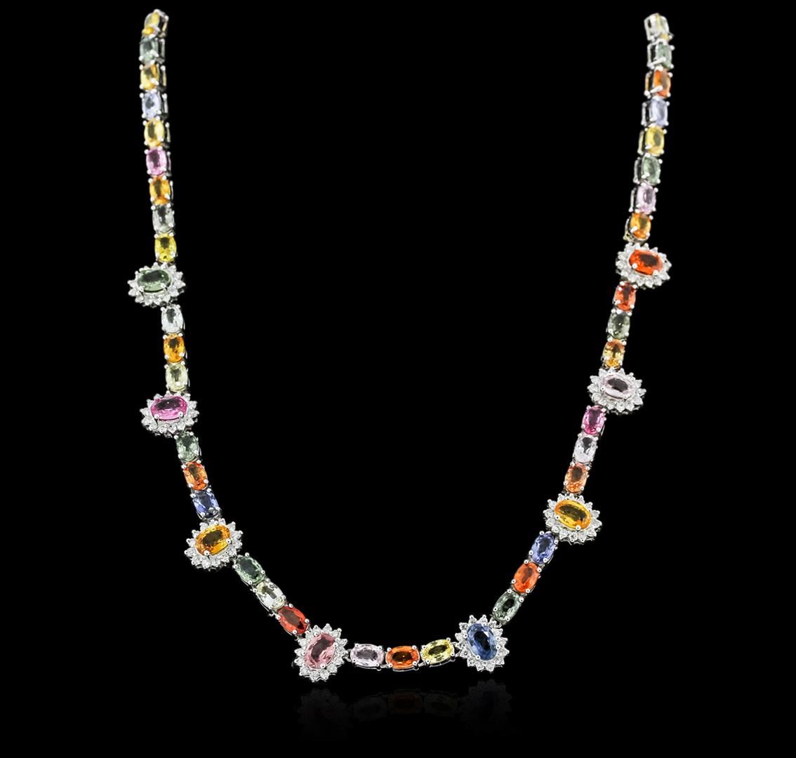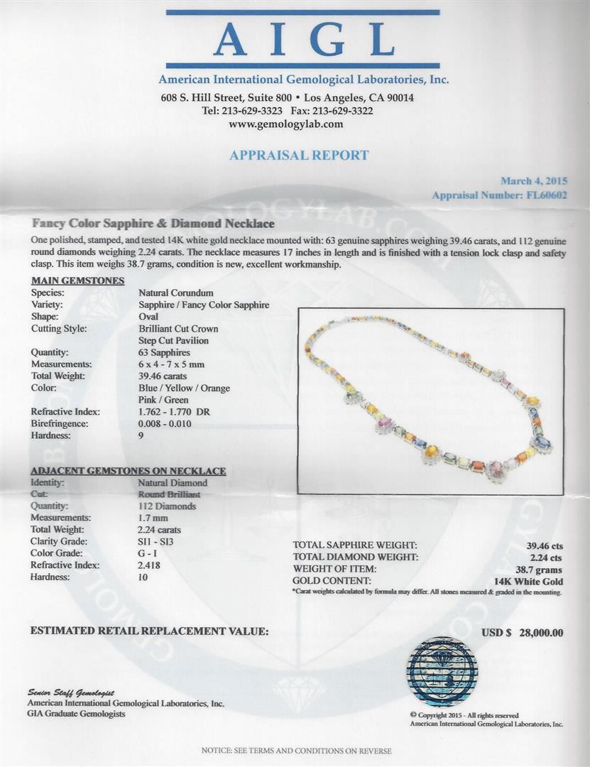 One polished, stamped, and tested 14K white gold necklace mounted with: 63 genuine sapphires weighing 39.46 carats, and 112 genuine round diamonds weighing 2.24 carats. The necklace measures 17 inches in length and is finished with a tension lock clasp and safety clasp. This item weighs 38.7 grams, condition is new, excellent workmanship. MAIN GEMSTONES: Species: Natural Corundum. Variety: Sapphire / Fancy Color Sapphire. Shape: Oval. Cutting Style: Brilliant Cut Crown Step Cut Pavilion. Quantity: 63 Sapphires. Measurements: 6 x 4 - 7 x 5 mm. Total Weight: 39.46 carats. Color: Blue / Yellow / Orange / Pink / Green. Refractive Index: 1.762 - 1.770 DR. Birefringence: 0.008 - 0.010. Hardness 9. ADJACENT GEMSTONES ON NECKLACE: Identity: Natural Diamond. Cut: Round Brilliant. Quantity: 112 Diamonds. Measurements: 1.7 mm. Total Weight: 2.24 carats. Clarity Grade: SI1 - SI3. Color Grade: G - I. Refractive Index: 2.418. Hardness: 10. Total Sapphire Weight: 39.46 cts. Total Diamond Weight: 2.24 cts. Weight of Item: 38.7 grams. Gold Content: 14K White Gold. AIGL Appraised at $28,000.00.