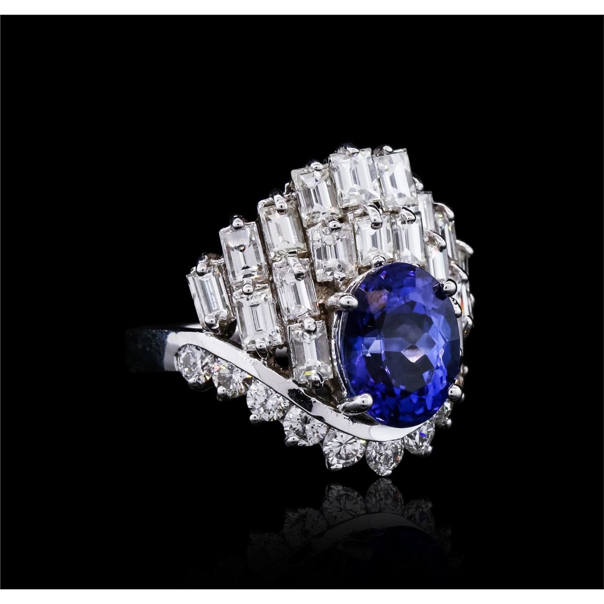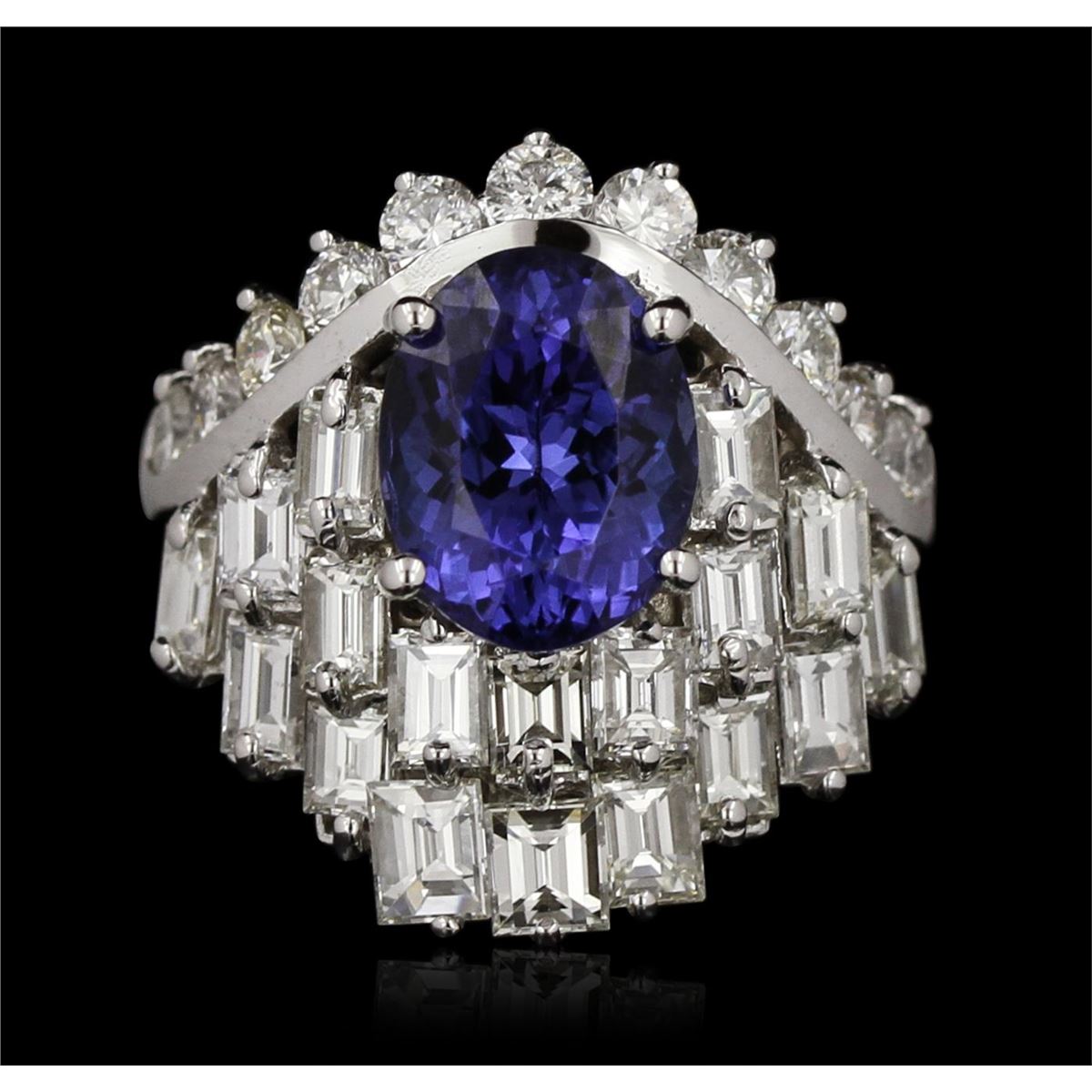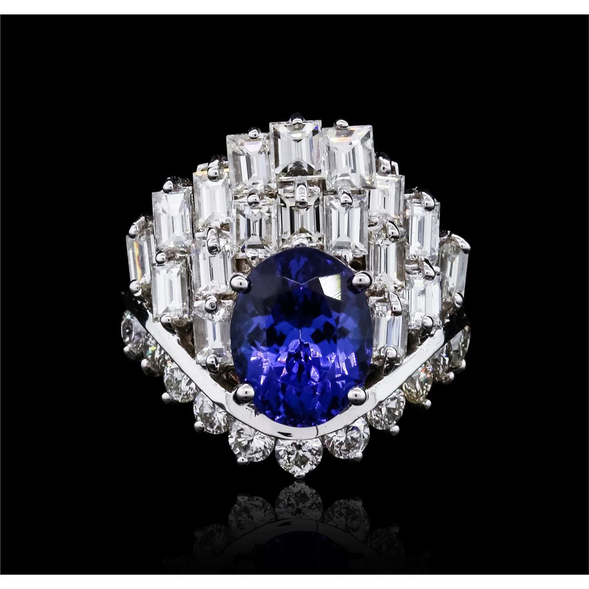 One polished, stamped, and electronically tested solid 14KT White Gold ring mounted with: 1 genuine tanzanite center stone weighing 4.00 carats, 18 genuine baguette cut diamonds weighing 3.08 carats, and 11 genuine round diamonds weighing 0.94 carats. This item weighs 9.6 grams, condition is new, excellent workmanship. AIGL Appraised at $20,930.00.