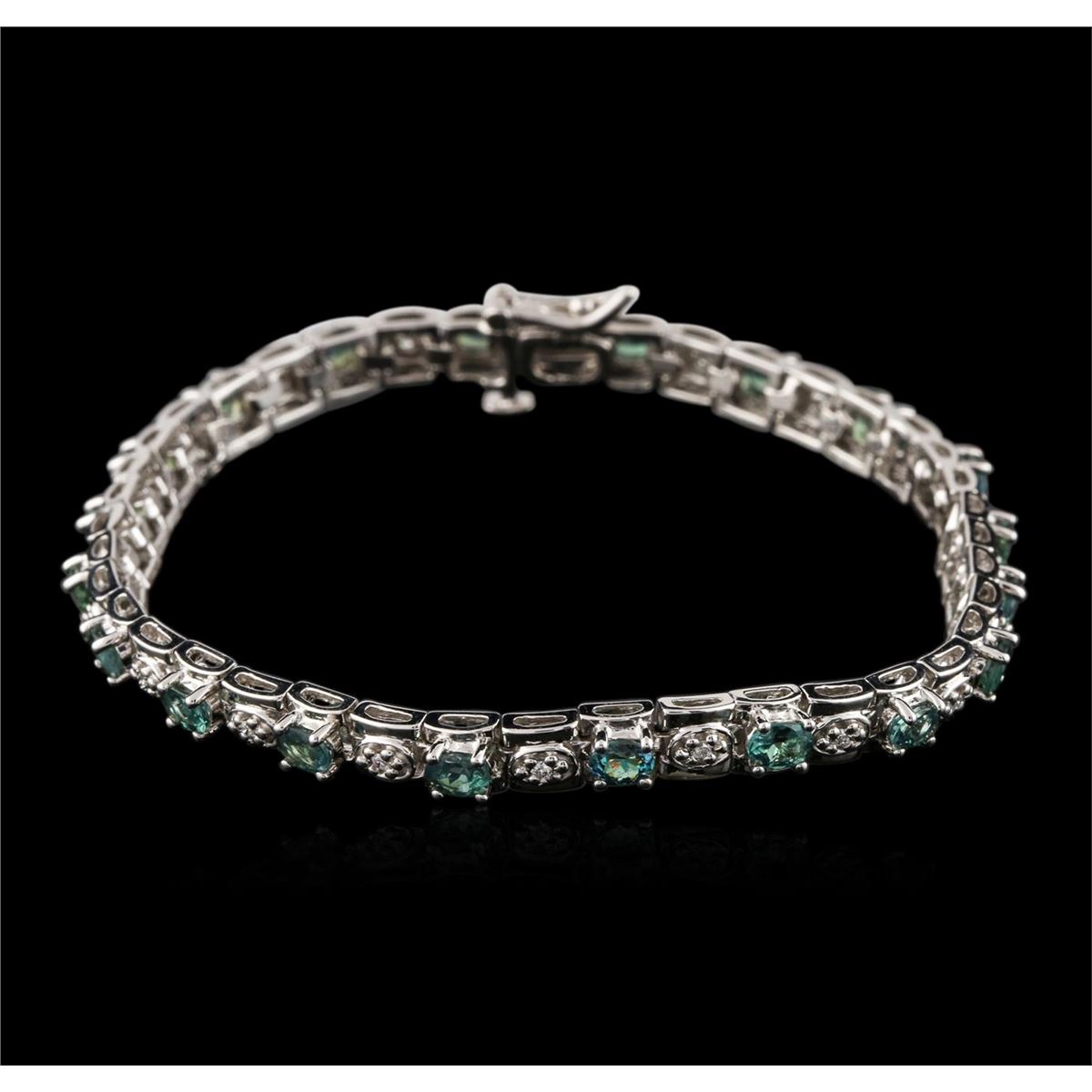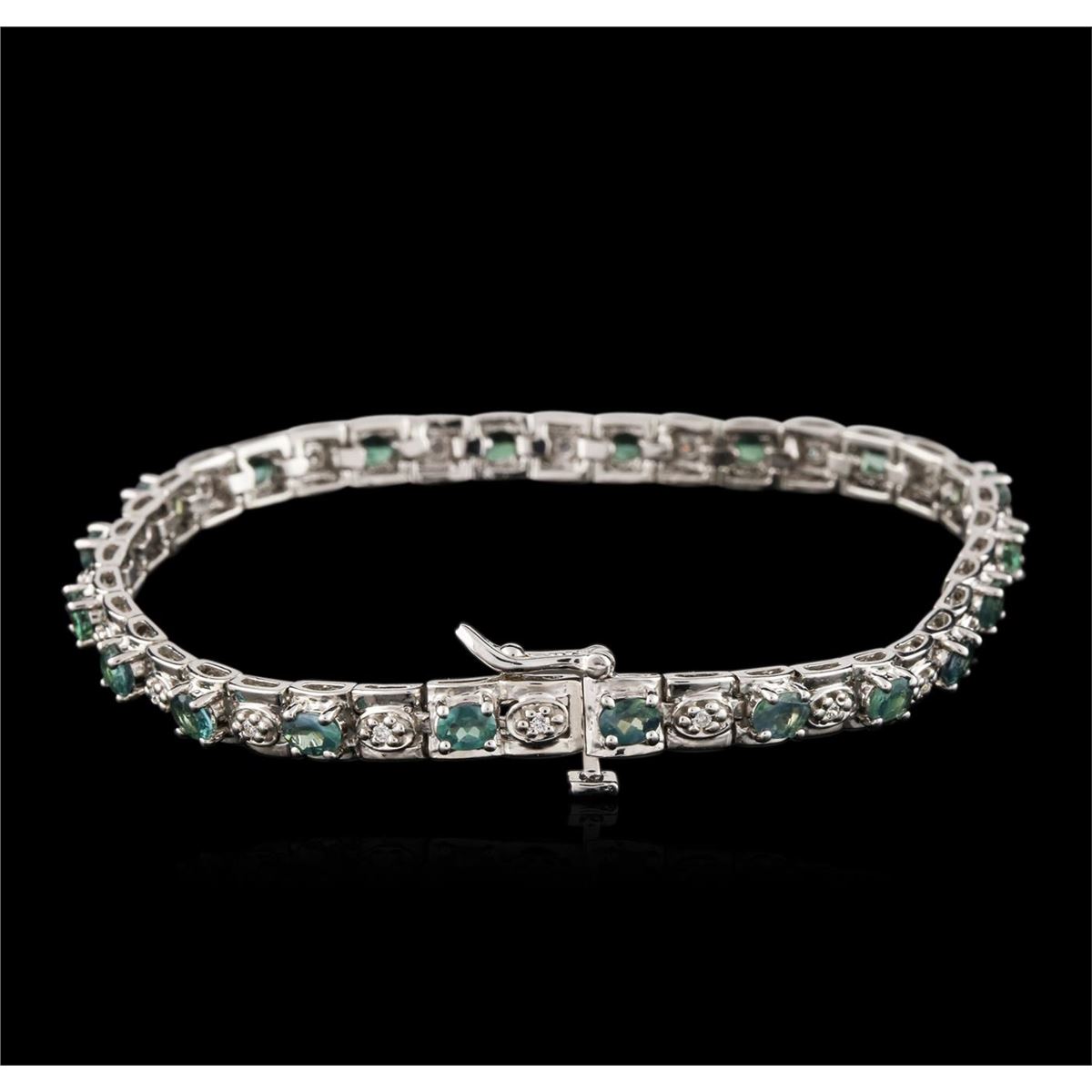 One electronically tested 14KT white gold ladies cast bracelet with a hidden box clasp with safety closer with a bright polish finish. Measurements: 7" in length Identified with markings of "14K". Condition is new. Containing: Twenty prong set oval modified brilliant cut natural green chrysoberyls, measuring 4.40 x 3.00. x 1.95mm,approximate total weight of 4.00.ct., clarity is slightly included, type I, medium light, moderately strong, green color, (GIA YG 4/4), cut is good. Twenty prong set round brilliant cut diamonds, measuring 1.30 - 1.30 x 0.78mm (depth est.) approximate total weight of 20 Stones = 0.16ct. Clarity: SI-1. Color: J - K, Cut is Good. Colored gemstones are presumed to have been subjected to commonly used enhancement processes. All diamonds and colored gemstones are graded in the mounting, unless otherwise stated. Total Weight of Colored Stones 4.00.ct. Total Weight of Diamonds 0.16ct. Total Weight of Bracelet 13.70 grams. GGL Appraised at $3,785.00.