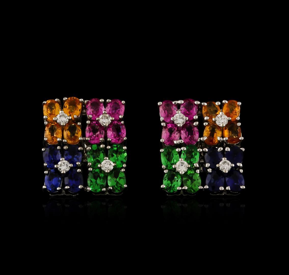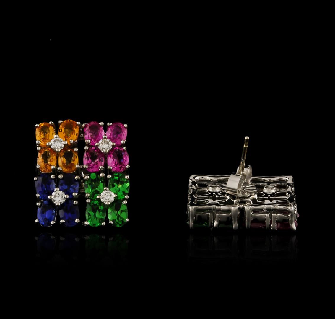One pair of earrings featuring: 14KT white gold weighing 7.30 grams containing multicolor sapphires with a total weight of 4.00ct and prong set round diamonds with a total weight of 0.15ct.