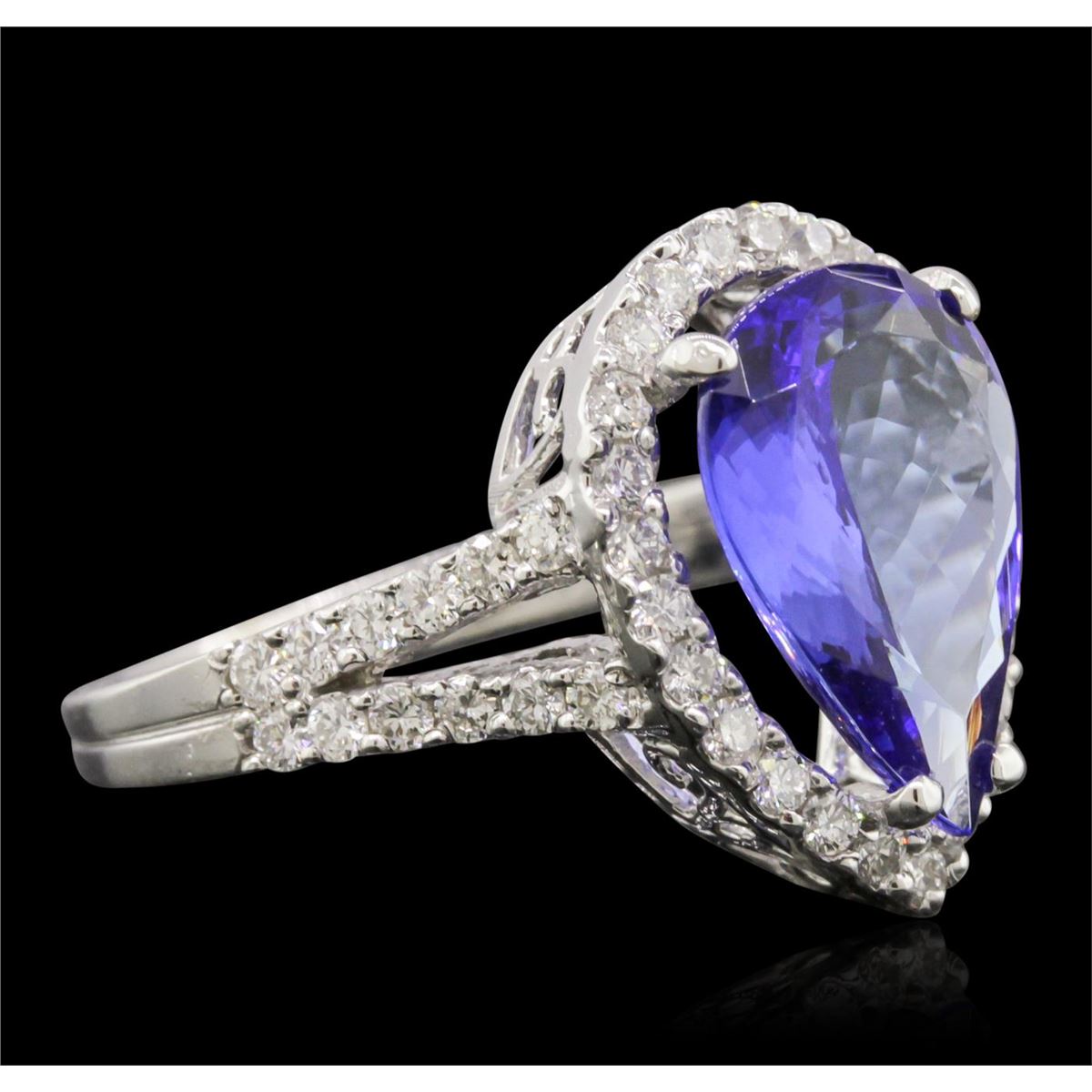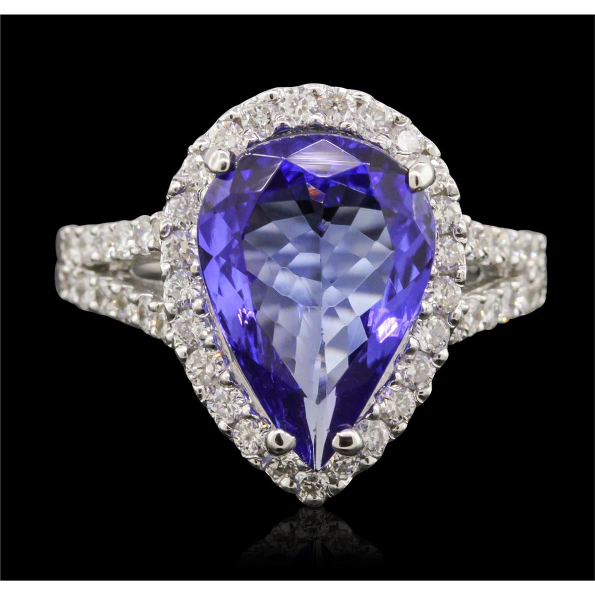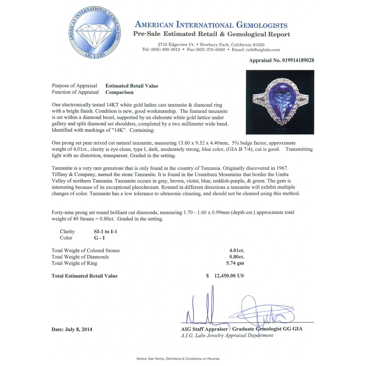 One electronically tested 14KT white gold ladies cast tanzanite & diamond ring with a bright finish. The featured tanzanite is set within a diamond bezel, supported by an elaborate white gold lattice under gallery and split diamond set shoulders, completed by a two millimeter wide band. Identified with markings of "14K". Condition is new, good workmanship. Containing: One prong set pear mixed cut natural tanzanite, measuring 13.60 x 9.52 x 4.40mm, 5%. bulge factor, approximate weight of 4.01ct., clarity is eye clean, type I, dark, moderately strong, blue color, (GIA B 7/4), cut is good. Transmitting light with no distortion, transparent. Graded in the setting. Tanzanite is a very rare gemstone that is only found in the country of Tanzania. Originally discovered in 1967. Tiffany & Company, named the stone Tanzanite. It is found in the Usumburu Mountains that border the Umba Valley of northern Tanzania. Tanzanite occurs in gray, brown, violet, blue, reddish-purple, & green. The gem is interesting because of its exceptional pleochroism. Rotated in different directions a tanzanite will exhibit multiple changes of color. Tanzanite has a low tolerance to ultrasonic cleaning, and should not be cleaned using this method. Forty-Nine prong set round brilliant cut diamonds, measuring 1.70 - 1.60 x 0.99mm (depth est.) approximate total weight of 49 Stones = 0.80ct. Graded in the setting. Clarity: SI-1 to I-1 . Color: G - I. Total Weight of Colored Stones 4.01ct. Total Weight of Diamonds 0.80ct. Total Weight of Ring 5.74 grams. AIG Appraised at $12,450.00.