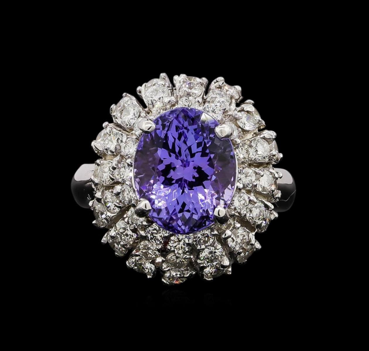 One electronically tested 14KT white gold ladies cast tanzanite and diamond ring with a bright polish finish. Identified with markings of "14K". Condition is new. Containing: One prong set oval modified brilliant cut natural tanzanite, measuring 10.60 x 8.80 x 6.13mm, approximate weight of 4.02ct., clarity is eye clean, type I, medium, moderately strong, violet color, (GIA V 5/4), cut is good. Forty-Eight prong set round brilliant cut diamonds, measuring 1.80 - 1.50 x 0.99mm (depth est.) approximate total weight of 48 Stones = 0.79ct. Clarity: SI-1 to SI-2. Color: I - J, Cut is Good. Colored gemstones are presumed to have been subjected to commonly used enhancement processes. All diamonds and colored gemstones are graded in the mounting, unless otherwise stated. Total Weight of Colored Stones 4.02ct. Total Weight of Diamonds 0.79ct. Total Weight of Ring 7.60 grams. GGL Appraised.