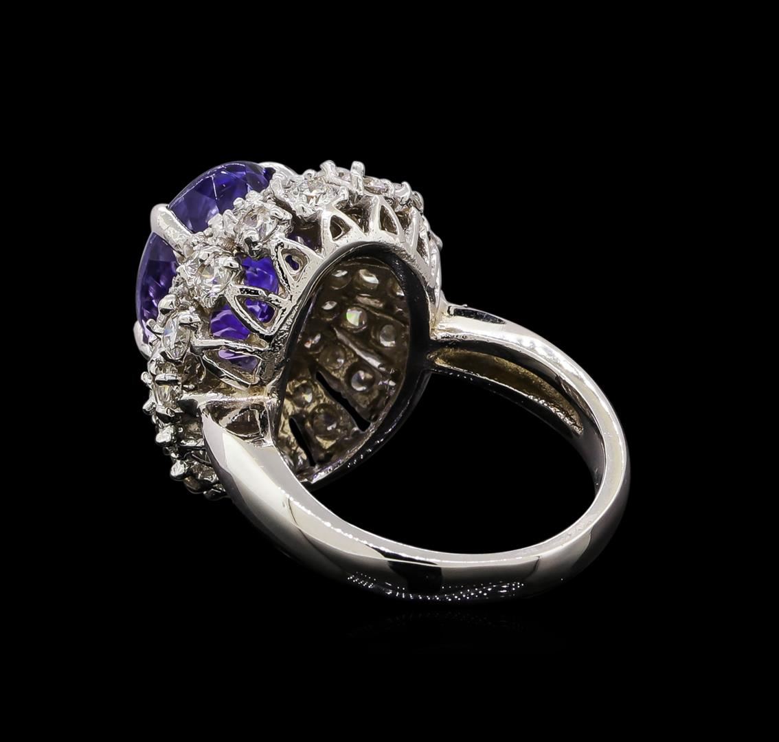 One electronically tested 14KT white gold ladies cast tanzanite and diamond ring with a bright polish finish. Identified with markings of "14K". Condition is new. Containing: One prong set oval modified brilliant cut natural tanzanite, measuring 10.60 x 8.80 x 6.13mm, approximate weight of 4.02ct., clarity is eye clean, type I, medium, moderately strong, violet color, (GIA V 5/4), cut is good. Forty-Eight prong set round brilliant cut diamonds, measuring 1.80 - 1.50 x 0.99mm (depth est.) approximate total weight of 48 Stones = 0.79ct. Clarity: SI-1 to SI-2. Color: I - J, Cut is Good. Colored gemstones are presumed to have been subjected to commonly used enhancement processes. All diamonds and colored gemstones are graded in the mounting, unless otherwise stated. Total Weight of Colored Stones 4.02ct. Total Weight of Diamonds 0.79ct. Total Weight of Ring 7.60 grams. GGL Appraised.