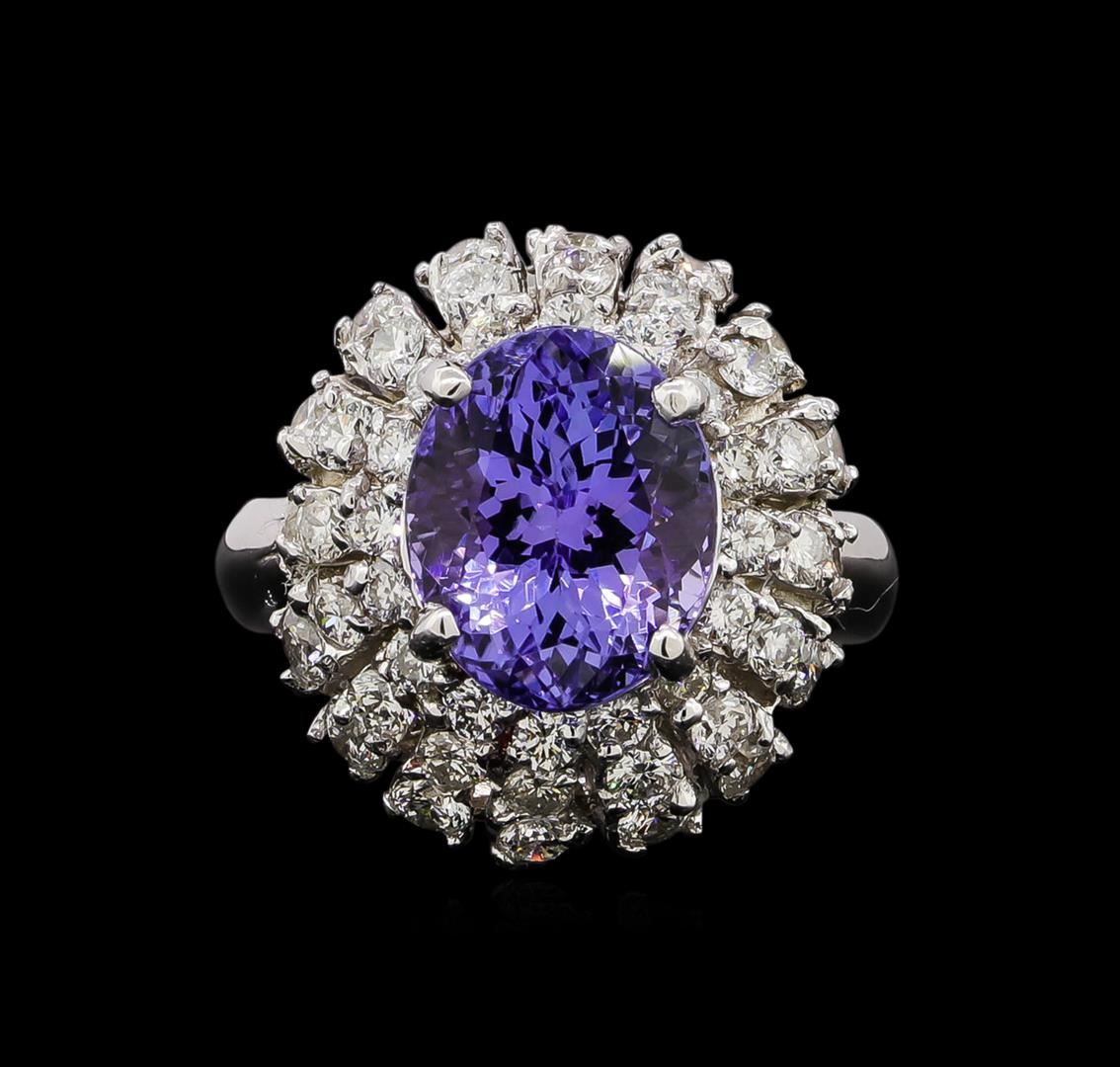 One electronically tested 14KT white gold ladies cast tanzanite and diamond ring with a bright polish finish. Identified with markings of "14K". Condition is new. Containing: One prong set oval modified brilliant cut natural tanzanite, measuring 10.60 x 8.80 x 6.13mm, approximate weight of 4.02ct., clarity is eye clean, type I, medium, moderately strong, violet color, (GIA V 5/4), cut is good. Forty-Eight prong set round brilliant cut diamonds, measuring 1.80 - 1.50 x 0.99mm (depth est.) approximate total weight of 48 Stones = 0.79ct. Clarity: SI-1 to SI-2. Color: I - J, Cut is Good. Colored gemstones are presumed to have been subjected to commonly used enhancement processes. All diamonds and colored gemstones are graded in the mounting, unless otherwise stated. Total Weight of Colored Stones 4.02ct. Total Weight of Diamonds 0.79ct. Total Weight of Ring 7.60 grams. GGL Appraised.