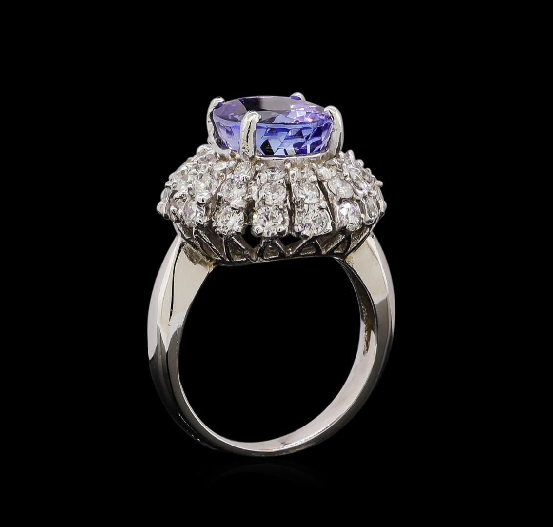 One electronically tested 14KT white gold ladies cast tanzanite and diamond ring with a bright polish finish. Identified with markings of "14K". Condition is new. Containing: One prong set oval modified brilliant cut natural tanzanite, measuring 10.60 x 8.80 x 6.13mm, approximate weight of 4.02ct., clarity is eye clean, type I, medium, moderately strong, violet color, (GIA V 5/4), cut is good. Forty-Eight prong set round brilliant cut diamonds, measuring 1.80 - 1.50 x 0.99mm (depth est.) approximate total weight of 48 Stones = 0.79ct. Clarity: SI-1 to SI-2. Color: I - J, Cut is Good. Colored gemstones are presumed to have been subjected to commonly used enhancement processes. All diamonds and colored gemstones are graded in the mounting, unless otherwise stated. Total Weight of Colored Stones 4.02ct. Total Weight of Diamonds 0.79ct. Total Weight of Ring 7.60 grams. GGL Appraised.