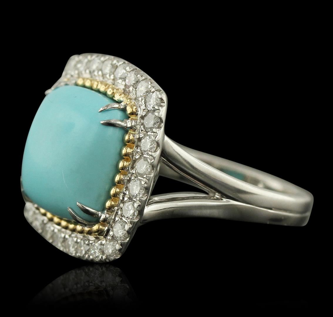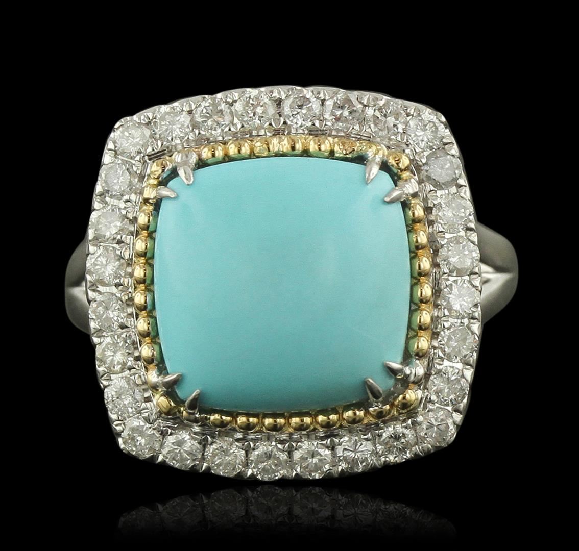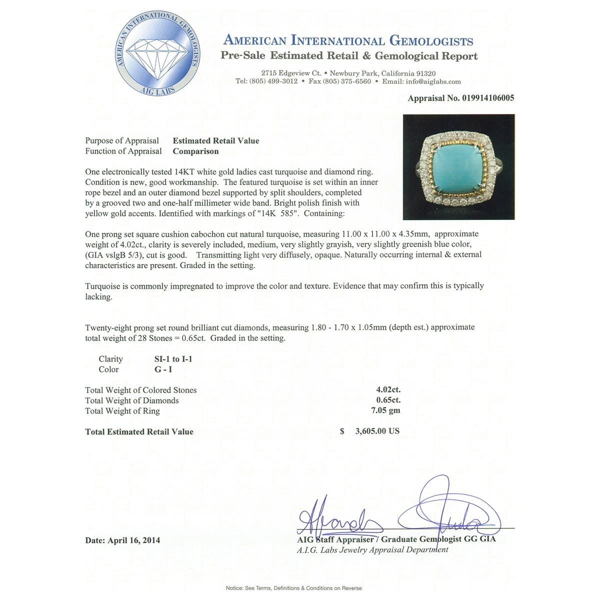 One electronically tested 14KT white gold ladies cast turquoise and diamond ring. Condition is new, good workmanship. The featured turquoise is set within an inner rope bezel and an outer diamond bezel supported by split shoulders, completed by a grooved two and one-half millimeter wide band. Bright polish finish with yellow gold accents. Identified with markings of "14K 585". Containing: One prong set square cushion cabochon cut natural turquoise, measuring 11.00 x 11.00 x 4.35mm, approximate weight of 4.02ct., clarity is severely included, medium, very slightly grayish, very slightly greenish blue color, (GIA vslgB 5/3), cut is good. Transmitting light very diffusely, opaque. Naturally occurring internal & external characteristics are present. Graded in the setting. Turquoise is commonly impregnated to improve the color and texture. Evidence that may confirm this is typically lacking. Twenty-Eight prong set round brilliant cut diamonds, measuring 1.80 - 1.70 x 1.05mm (depth est.) approximate. Total Weight of 28 Stones = 0.65ct. Graded in the setting. Clarity: SI-1 to I-1. Color: G - I. Total Weight of Colored Stones 4.02ct. Total Weight of Diamonds 0.65ct. Total Weight of Ring 7.05 grams. AIG Appraised at $3,605.00.