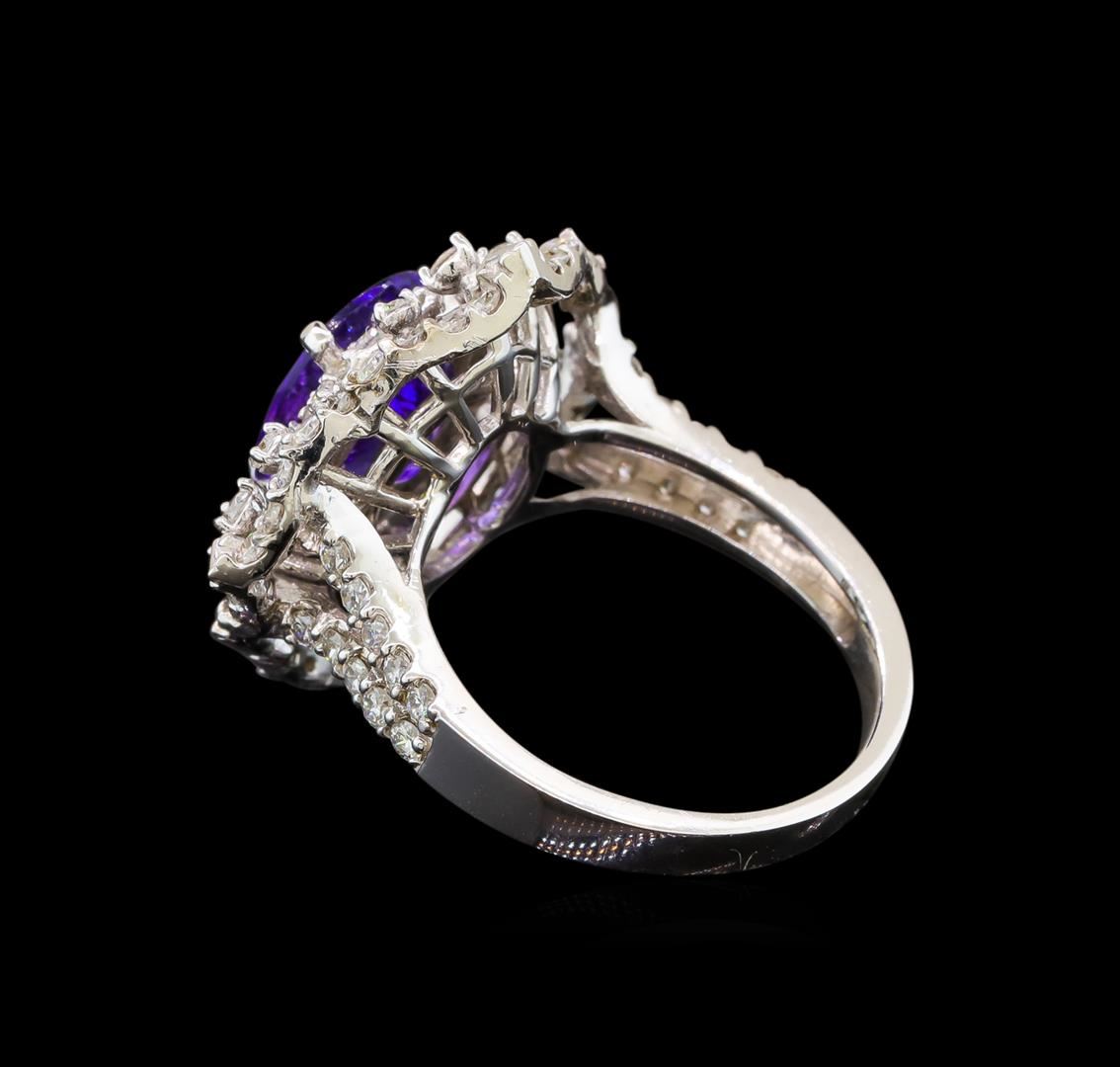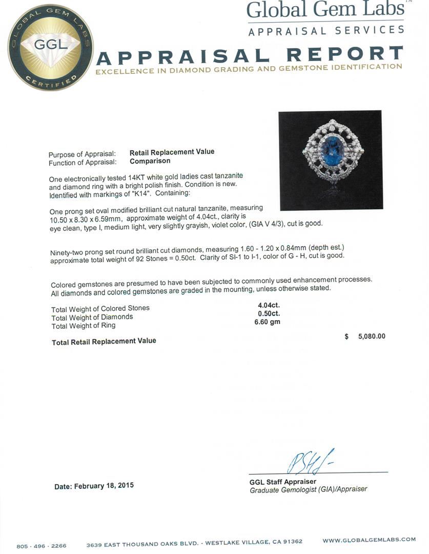 One electronically tested 14KT white gold ladies cast tanzanite and diamond ring with a bright polish finish. Identified with markings of "K14". Condition is new. Containing: One prong set oval modified brilliant cut natural tanzanite, measuring 10.50 x 8.30 x 6.59mm, approximate weight of 4.04ct., clarity is eye clean, type I, medium light, very slightly grayish, violet color, (GIA V 4/3), cut is good. Ninety-Two prong set round brilliant cut diamonds, measuring 1.60 - 1.20 x 0.84mm (depth est.) approximate total weight of 92 Stones = 0.50ct. Clarity: SI-1 to I-1. Color: G - H, Cut is Good. Colored gemstones are presumed to have been subjected to commonly used enhancement processes. All diamonds and colored gemstones are graded in the mounting, unless otherwise stated. Total Weight of Colored Stones 4.04ct. Total Weight of Diamonds 0.50ct. Total Weight of Ring 6.60 grams. GGL Appraised at $5,080.00.