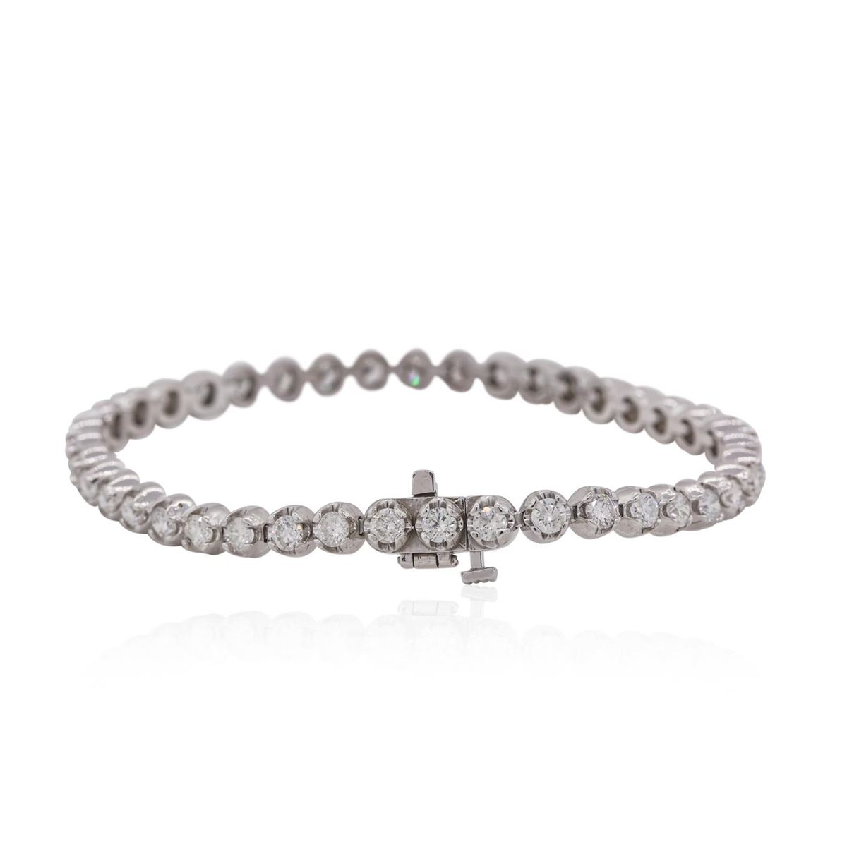 One electronically tested 14KT white gold ladies combination cast & assembled diamond tennis bracelet with a hidden box clasp with safety closer with a bright polish finish. Measurements: 7 in length. Identified with markings of 14K. Condition is new. Containing: Forty-One prong set round brilliant cut diamonds, measuring 3.00 - 3.00 x 1.80mm (depth est.) approximate total weight of 41 Stones = 4.05ct. Clarity: SI-1 to I-1. Color: I - J, Cut is Good. All diamonds are graded in the mounting, unless otherwise stated. Total Weight of Diamonds 4.05ct. Total Weight of Tennis Bracelet 15.60 grams. GGL Appraised at $11,115.00.
