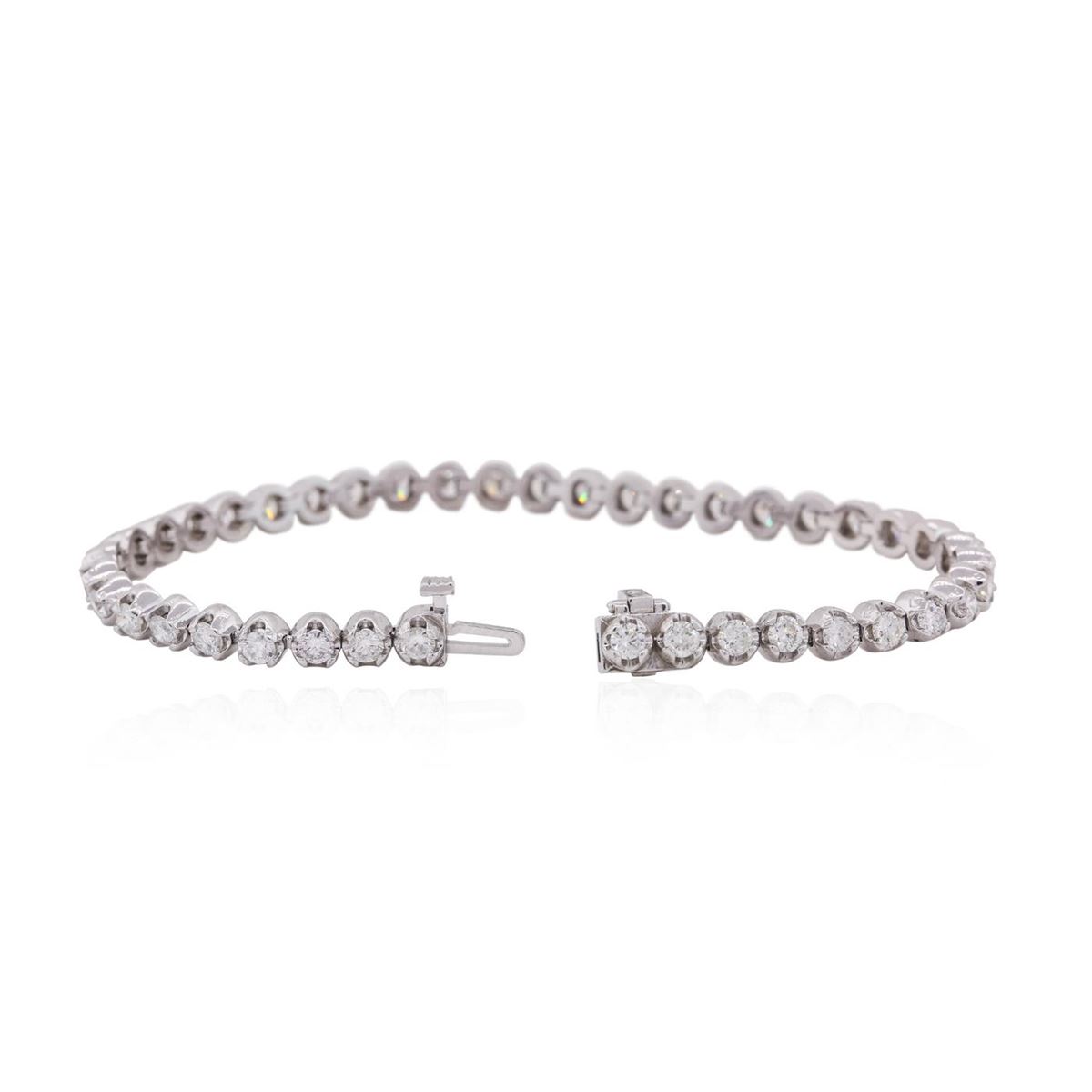 One electronically tested 14KT white gold ladies combination cast & assembled diamond tennis bracelet with a hidden box clasp with safety closer with a bright polish finish. Measurements: 7 in length. Identified with markings of 14K. Condition is new. Containing: Forty-One prong set round brilliant cut diamonds, measuring 3.00 - 3.00 x 1.80mm (depth est.) approximate total weight of 41 Stones = 4.05ct. Clarity: SI-1 to I-1. Color: I - J, Cut is Good. All diamonds are graded in the mounting, unless otherwise stated. Total Weight of Diamonds 4.05ct. Total Weight of Tennis Bracelet 15.60 grams. GGL Appraised at $11,115.00.
