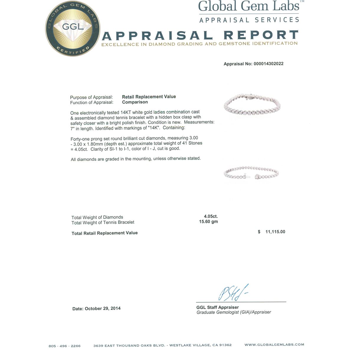 One electronically tested 14KT white gold ladies combination cast & assembled diamond tennis bracelet with a hidden box clasp with safety closer with a bright polish finish. Measurements: 7 in length. Identified with markings of 14K. Condition is new. Containing: Forty-One prong set round brilliant cut diamonds, measuring 3.00 - 3.00 x 1.80mm (depth est.) approximate total weight of 41 Stones = 4.05ct. Clarity: SI-1 to I-1. Color: I - J, Cut is Good. All diamonds are graded in the mounting, unless otherwise stated. Total Weight of Diamonds 4.05ct. Total Weight of Tennis Bracelet 15.60 grams. GGL Appraised at $11,115.00.