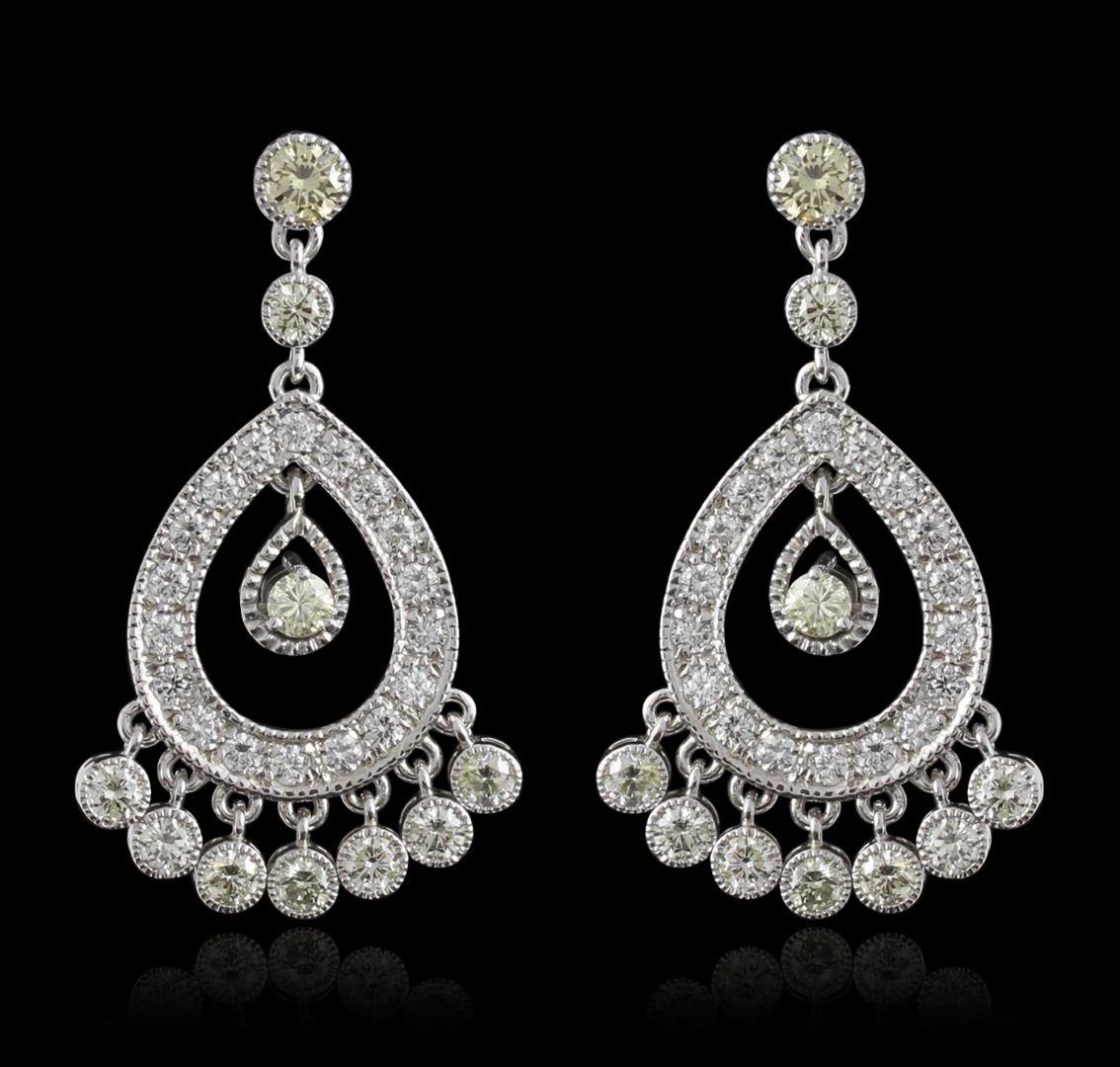One pair electronically tested 14KT white gold ladies cast & assembled diamond dangle earrings with standard backs. Bright polish finish with migraine detailing throughout. Identified with markings of "585". Condition is new, good workmanship. Containing: Fifty-Six prong and bezel set round brilliant cut diamonds, measuring 4.00 - 2.70 x 2.01mm (depth est.) approximate total weight of 56 Stones = 4.07ct. The color grade reflects the entire range of color for the group. Graded in the setting. Clarity VS-2 to SI-2. Color G to Light Yellow. Total Weight of Diamonds 4.07ct. Total Weight of Earrings 10.71gm. AIG Appraised at $12,670.00.