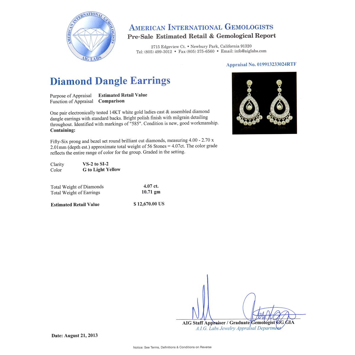 One pair electronically tested 14KT white gold ladies cast & assembled diamond dangle earrings with standard backs. Bright polish finish with migraine detailing throughout. Identified with markings of "585". Condition is new, good workmanship. Containing: Fifty-Six prong and bezel set round brilliant cut diamonds, measuring 4.00 - 2.70 x 2.01mm (depth est.) approximate total weight of 56 Stones = 4.07ct. The color grade reflects the entire range of color for the group. Graded in the setting. Clarity VS-2 to SI-2. Color G to Light Yellow. Total Weight of Diamonds 4.07ct. Total Weight of Earrings 10.71gm. AIG Appraised at $12,670.00.