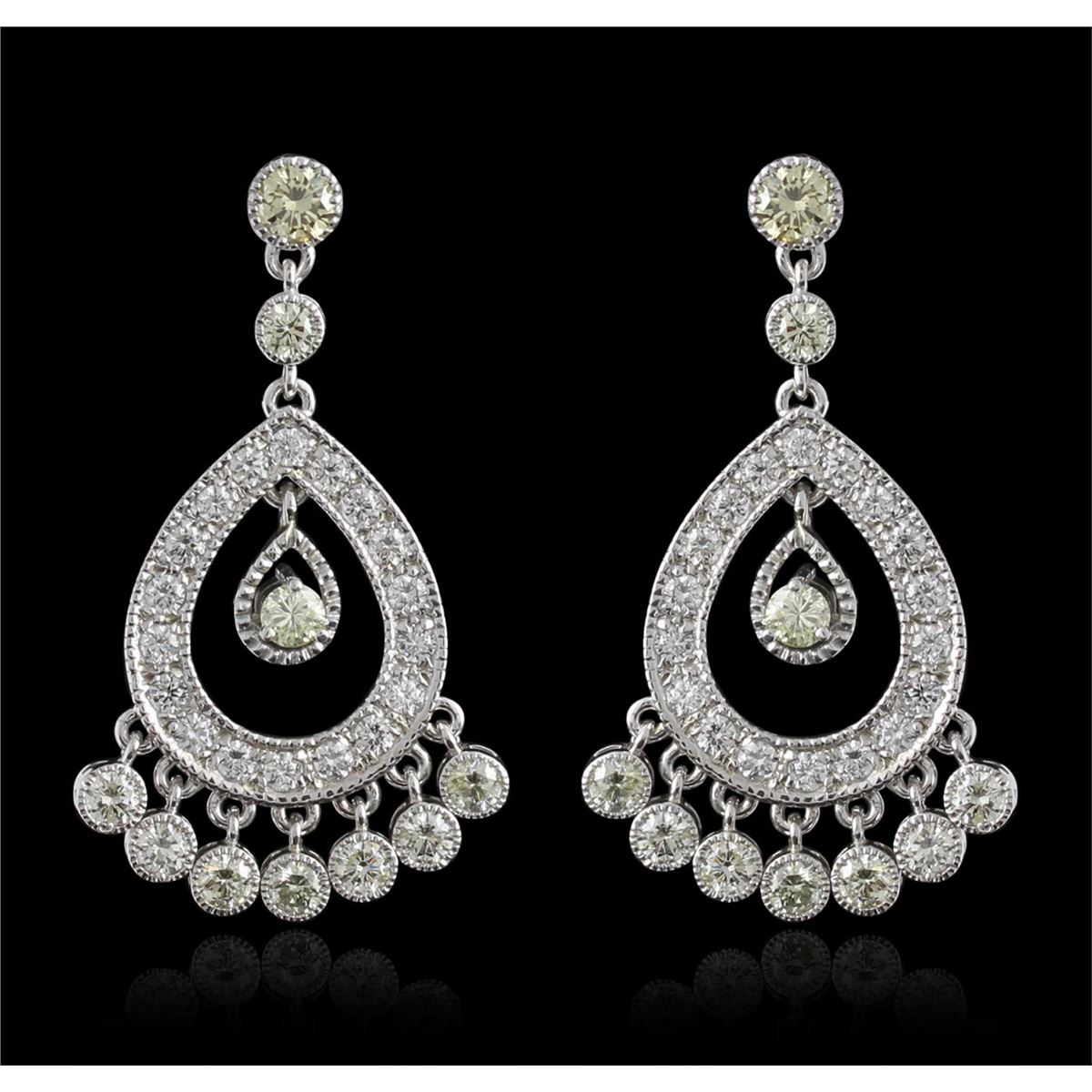One pair electronically tested 14KT white gold ladies cast & assembled diamond dangle earrings with standard backs. Bright polish finish with migraine detailing throughout. Identified with markings of "585". Condition is new, good workmanship. Containing: Fifty-Six prong and bezel set round brilliant cut diamonds, measuring 4.00 - 2.70 x 2.01mm (depth est.) approximate total weight of 56 Stones = 4.07ct. The color grade reflects the entire range of color for the group. Graded in the setting. Clarity VS-2 to SI-2. Color G to Light Yellow. Total Weight of Diamonds 4.07ct. Total Weight of Earrings 10.71gm. AIG Appraised at $12,670.00.