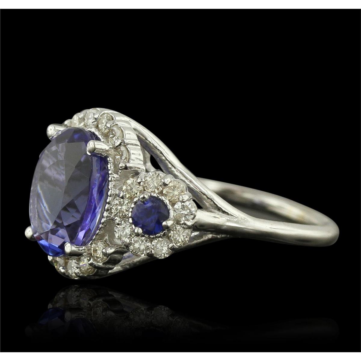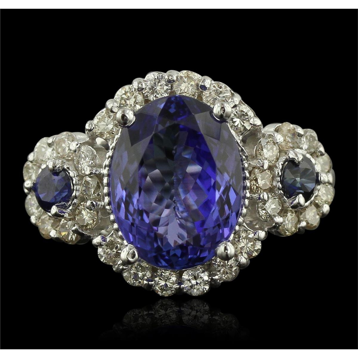 One electronically tested 14KT white gold ladies cast tanzanite and diamond ring with a bright polish finish. Condition is new, good workmanship. The featured tanzanite is set within a diamond bezel, supported by sapphire and diamond bezels, completed by a two millimeter wide band. Identified with markings of "14K". Containing: One prong set oval mixed cut natural tanzanite, measuring 11.00 x 8.25 x 5.30mm, 10%. bulge factor, approximate weight of 4.08ct., clarity is eye clean, type I, medium, very slightly grayish, bluish violet color, (GIA bV 5/3), cut is good. Transmitting light with no distortion, transparent. Graded in the setting. Tanzanite is a very rare gemstone that is only found in the country of Tanzania. Originally discovered in 1967. Tiffany & Company, named the stone Tanzanite. It is found in the Usumburu Mountains that border the Umba Valley of northern Tanzania. Tanzanite occurs in gray, brown, violet, blue, reddish-purple, & green. The gem is interesting because of its exceptional pleochroism. Rotated in different directions a tanzanite will exhibit multiple changes of color. Tanzanite has a low tolerance to ultrasonic cleaning, and should not be cleaned using this method. Two prong set round brilliant cut natural blue sapphires, measuring 3.10 - 3.10 x 2.02 mm, approximate. Total Weight of 0.33ct., clarity is slightly included, type II, medium dark, moderately strong, violetish blue color, (GIA vB 6/4), cut is good. Transmitting light with a minimum of distortion, transparent. Naturally occurring internal & external characteristics are present, including partial color zoning present. Color grade is an average for the group. Graded in the setting. Thirty prong set round brilliant cut diamonds, measuring 1.80 - 1.80 x 1.08mm (depth est.) approximate. Total Weight of 30 Stones = 0.84ct. Graded in the setting. Clarity: SI-2 to I-1. Color: G - I. Total Weight of Colored Stones 4.41ct. Total Weight of Diamonds 0.84ct. Total Weight of Ring 6.50 grams. AIG Appraised at $13,135.00.
