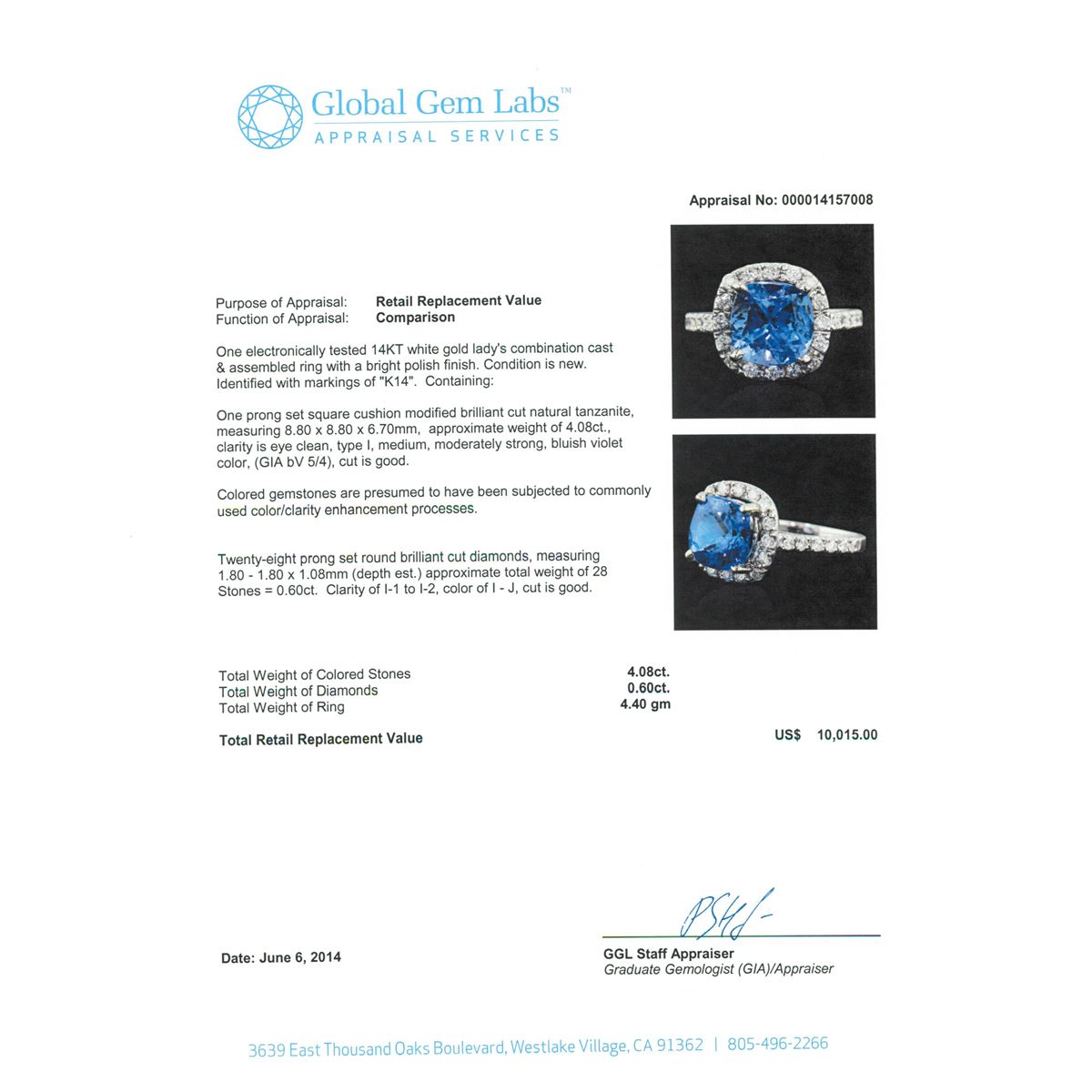One electronically tested 14KT white gold Ladies combination cast & assembled ring with a bright polish finish. Condition is new. Identified with markings of "K14". Containing: One prong set square cushion modified brilliant cut natural tanzanite, measuring 8.80 x 8.80 x 6.70mm, approximate weight of 4.08ct., clarity is eye clean, type I, medium, moderately strong, bluish violet color, (GIA bV 5/4), cut is good. Colored gemstones are presumed to have been subjected to commonly used color/clarity enhancement processes. Twenty-Eight prong set round brilliant cut diamonds, measuring 1.80 - 1.80 x 1.08mm (depth est.) approximate. Total Weight of 28 Stones = 0.60ct. Clarity: I-1 to I-2. Color: I - J, Cut is Good. Total Weight of Colored Stones 4.08ct. Total Weight of Diamonds 0.60ct. Total Weight of Ring 4.40 grams. GGL Appraised at $10,015.00.