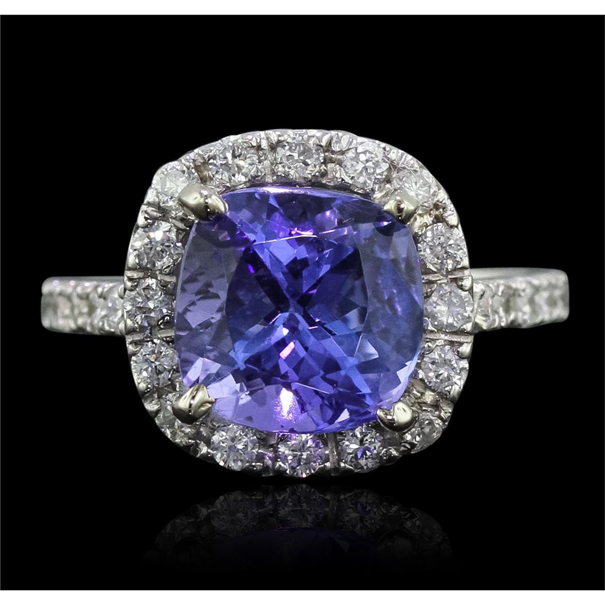 One electronically tested 14KT white gold Ladies combination cast & assembled ring with a bright polish finish. Condition is new. Identified with markings of "K14". Containing: One prong set square cushion modified brilliant cut natural tanzanite, measuring 8.80 x 8.80 x 6.70mm, approximate weight of 4.08ct., clarity is eye clean, type I, medium, moderately strong, bluish violet color, (GIA bV 5/4), cut is good. Colored gemstones are presumed to have been subjected to commonly used color/clarity enhancement processes. Twenty-Eight prong set round brilliant cut diamonds, measuring 1.80 - 1.80 x 1.08mm (depth est.) approximate. Total Weight of 28 Stones = 0.60ct. Clarity: I-1 to I-2. Color: I - J, Cut is Good. Total Weight of Colored Stones 4.08ct. Total Weight of Diamonds 0.60ct. Total Weight of Ring 4.40 grams. GGL Appraised at $10,015.00.