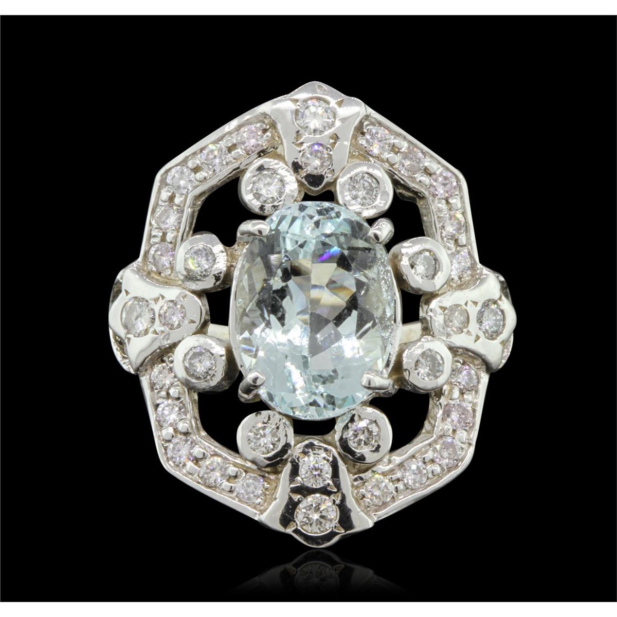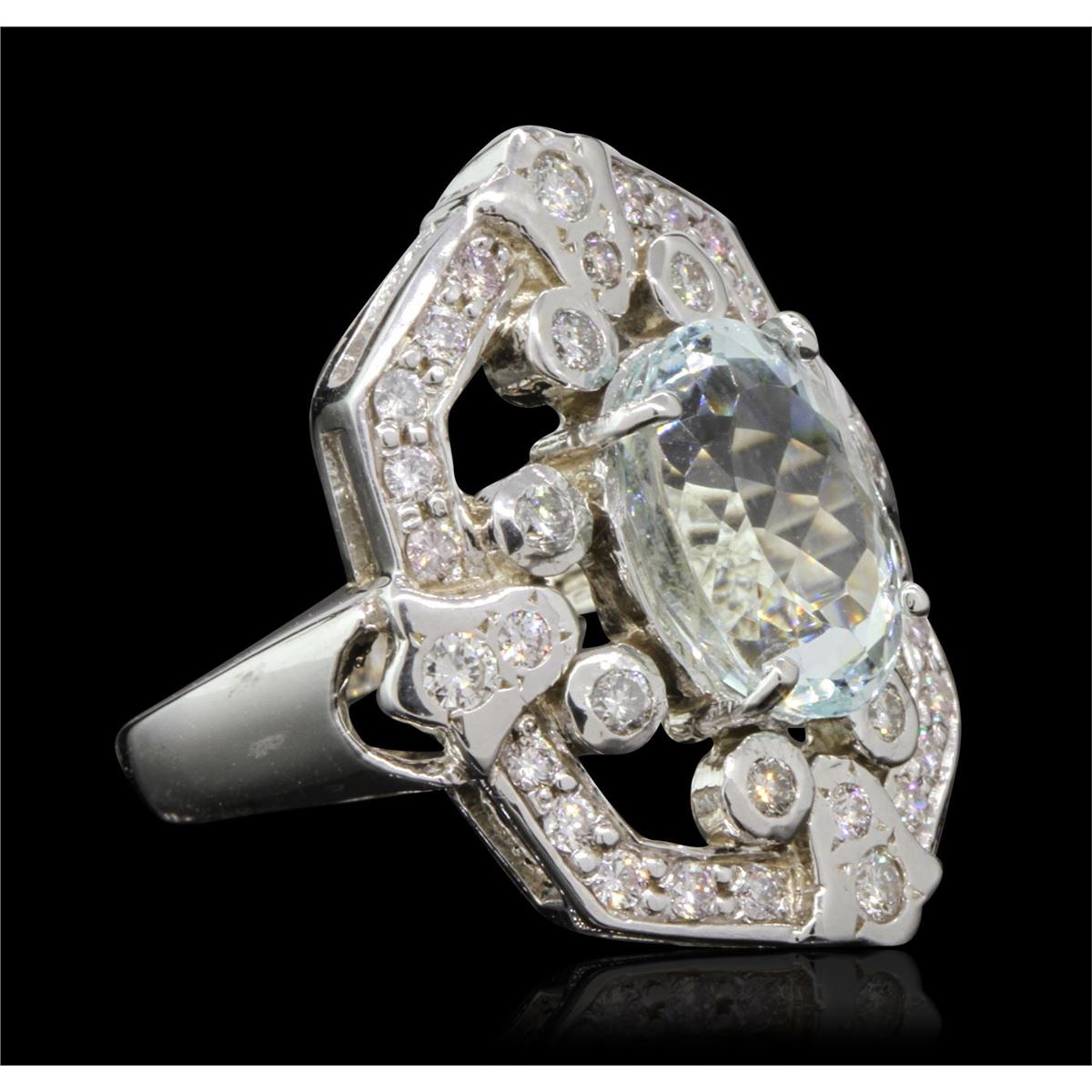 One electronically tested 14KT white gold ladies cast aquamarine & diamond ring with a bright polish finish. Condition is new, good workmanship. The featured aquamarine is set within a diamond set shield style bezel completed by three millimeter wide band. Identified with markings of "14K". Containing: One prong set oval mixed cut natural aquamarine, measuring 12.00 x 8.80 x 6.50mm, 7%. bulge factor, approximate weight of 4.09ct., clarity is eye clean, type I, medium light, slightly grayish, very slightly greenish blue color, (GIA vslgB 4/2), cut is good. Transmitting light with no distortion, transparent. Refractive index testing results of 1.55 to 1.56. This is a conclusive result for (beryl) aquamarine. Graded in the setting. Thirty-Six prong set round brilliant cut diamonds, measuring 2.30 - 1.80 x 1.25mm (depth est.) approximate. Total Weight of 36 Stones = 1.25ct. Graded in the setting. Clarity: SI-2 to I-1. Color: F - H. Total Weight of Colored Stones 4.09ct. Total Weight of Diamonds 1.25ct. Total Weight of Ring 8.96 grams. AIG Appraised at $7,300.00.