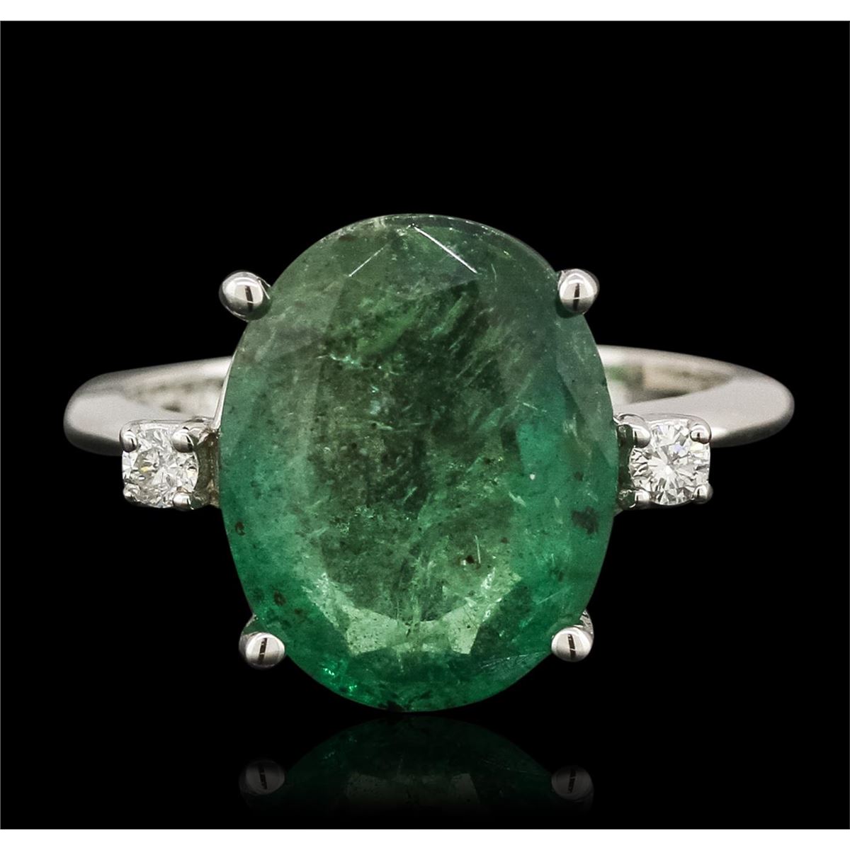 One electronically tested 14KT white gold ladies cast emerald and diamond ring with a bright polish finish. The featured emerald is accented by a single diamond on either side, completed by a two millimeter wide band. Identified with markings of "14K". Condition is new, good workmanship. Containing: One prong set oval mixed cut natural emerald, measuring 13.09 x 10.40 x 5.05mm, 8%. bulge factor, approximate weight of 4.09ct., clarity is heavily included, type III, medium dark, very slightly grayish, very slightly bluish green color, (GIA vslbG 6/3), cut is good. Transmitting light somewhat diffusely, transparent to translucent. Naturally occurring internal & external characteristics are present. Indications of oil residue. Graded in the setting. Two prong set round brilliant cut diamonds, measuring 2.10 - 2.10 x 1.26mm (depth est.) approximate. Total Weight of 2 Stones = 0.08ct. Graded in the setting. Clarity: SI-2. Color: G. Total Weight of Colored Stones 4.09ct. Total Weight of Diamonds 0.08ct. Total Weight of Ring 3.79gm. AIG Appraised at $7,615.00.