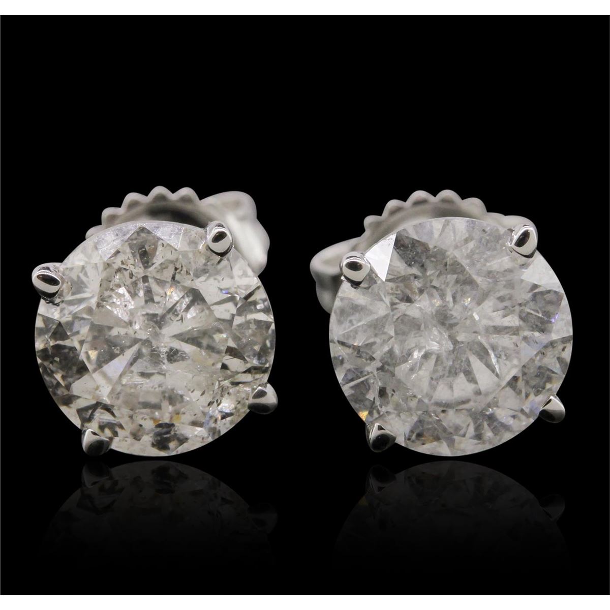 One electronically tested 14KT white gold Ladies cast stud earrings with friction posts with a bright polish finish. Condition is new. Identified with markings of "14K". Containing: One prong set round brilliant cut diamond, measuring 8.10 - 8.00 x 5.12mm (depth est.) approximate weight of 2.02ct. Clarity: I-3. Color: G, Cut is Good. One prong set round brilliant cut diamond, measuring 8.10 - 8.10 x 5.19mm (depth est.) approximate weight of 2.08ct. Clarity: I-3. Color: J, Cut is Good. Total Weight of Diamonds 4.10ct. Total Weight of Earrings 2.00 grams. GGL Appraised at $20,270.00.