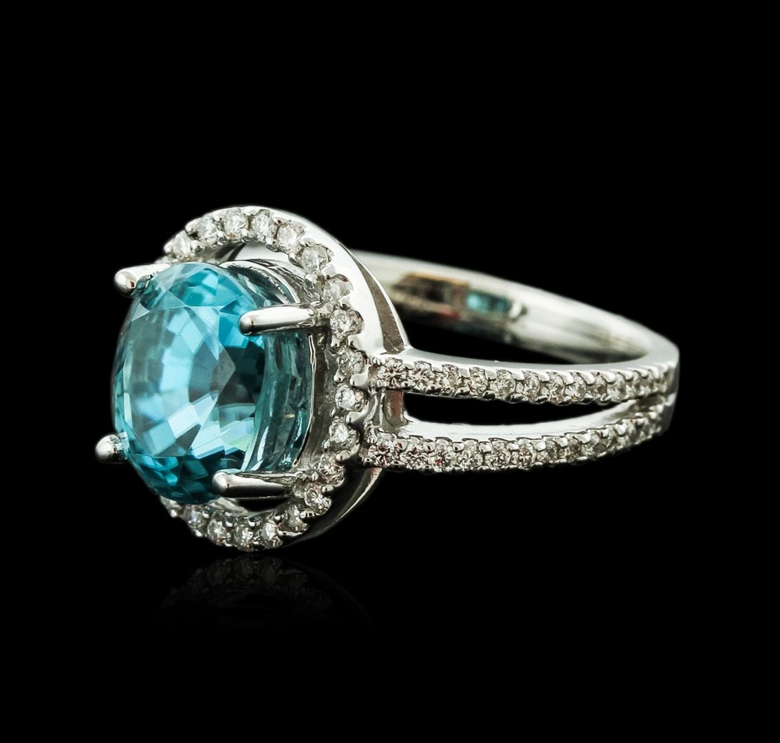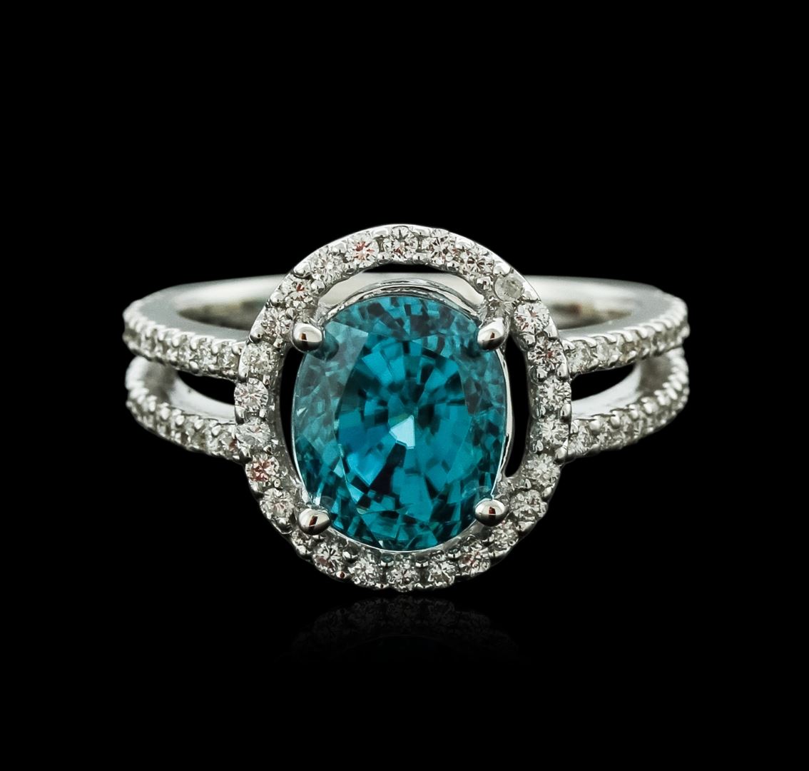 One electronically tested 14KT white gold ladies cast topaz and diamond ring with a bright polish finish. Identified with markings of "14K". Condition is new. Containing: One prong set oval modified brilliant cut natural blue topaz, measuring 9.50 x 7.60 x 7.70mm, approximate weight of 4.12ct., clarity is eye clean, type I, medium, moderately strong, blue color, (GIA B 5/4), cut is good. Seventy-Eight prong set round brilliant cut diamonds, measuring 1.30 - 1.30 x 0.78mm (depth est.) approximate total weight of 78 Stones = 0.62ct. Clarity: SI-2 to I-1. Color: H - I, Cut is Good. Colored gemstones are presumed to have been subjected to commonly used enhancement processes. All diamonds and colored gemstones are graded in the mounting, unless otherwise stated. Total Weight of Colored Stones 4.12ct. Total Weight of Diamonds 0.62ct. Total Weight of Ring 5.50 grams. GGL Appraised at $2,275.00.