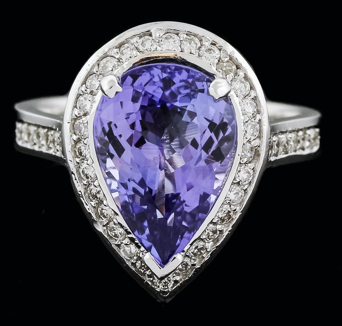 One electronically tested 14KT white gold ladies cast tanzanite and diamond ring with a bright polish finish. Identified with markings of "K14". Condition is new. Containing: One prong set pear modified brilliant cut natural tanzanite, measuring 12.25 x 9.12 x 5.52mm, approximate weight of 4.13ct., clarity is eye clean, type I, medium light, moderately strong, violet color, (GIA V 4/4), cut is good. Forty prong set round brilliant cut diamonds, measuring 1.30 - 1.30 x 0.78mm (depth est.) approximate. Total Weight of 40 Stones = 0.32ct. Clarity: SI-1 to SI-2. Color: I - J, Cut is Good. Colored gemstones are presumed to have been subjected to commonly used enhancement processes. All diamonds and colored gemstones are graded in the mounting, unless otherwise stated. Total Weight of Colored Stones 4.13ct. Total Weight of Diamonds 0.32ct. Total Weight of Ring 5.70 grams. GGL Appraised at $4,035.00.