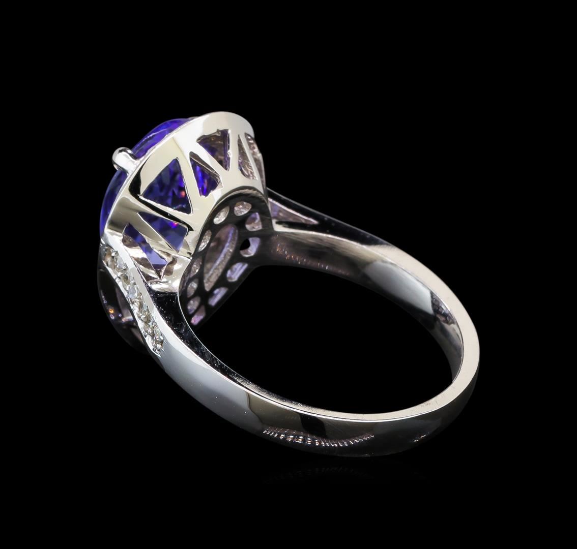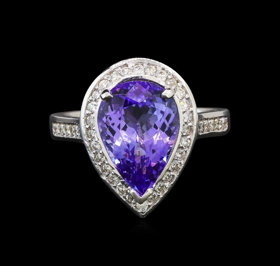One electronically tested 14KT white gold ladies cast tanzanite and diamond ring with a bright polish finish. Identified with markings of "K14". Condition is new. Containing: One prong set pear modified brilliant cut natural tanzanite, measuring 12.25 x 9.12 x 5.52mm, approximate weight of 4.13ct., clarity is eye clean, type I, medium light, moderately strong, violet color, (GIA V 4/4), cut is good. Forty prong set round brilliant cut diamonds, measuring 1.30 - 1.30 x 0.78mm (depth est.) approximate. Total Weight of 40 Stones = 0.32ct. Clarity: SI-1 to SI-2. Color: I - J, Cut is Good. Colored gemstones are presumed to have been subjected to commonly used enhancement processes. All diamonds and colored gemstones are graded in the mounting, unless otherwise stated. Total Weight of Colored Stones 4.13ct. Total Weight of Diamonds 0.32ct. Total Weight of Ring 5.70 grams. GGL Appraised at $4,035.00.