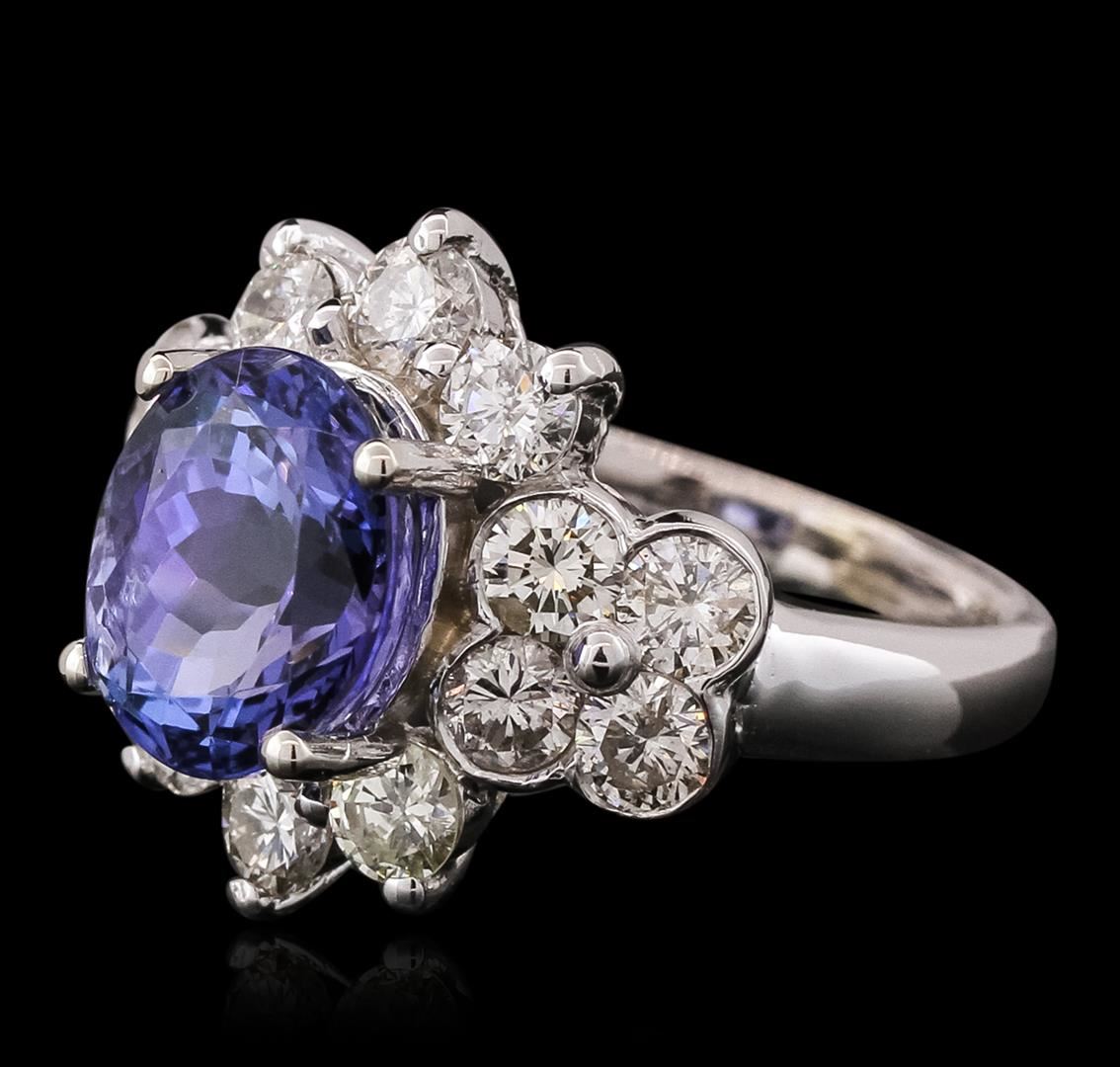 One electronically tested 14KT white gold ladies combination cast & assembled tanzanite and diamond ring with a flat shank with a bright polish finish. Identified with markings of "14K". Condition is new. Containing: One prong set oval modified brilliant cut natural tanzanite, measuring 10.35 x 8.45 x 7.00mm, approximate weight of 4.14ct., clarity is eye clean, type I, medium, very slightly grayish, violet color, (GIA V 5/3), cut is good. Fourteen prong set round brilliant cut diamonds, measuring 3.20 - 3.20 x 1.92mm (depth est.) approximate total weight of 14 Stones = 1.68ct. Clarity: SI-1 to I-1. Color: I - K, Cut is Good. Colored gemstones are presumed to have been subjected to commonly used enhancement processes. All diamonds and colored gemstones are graded in the mounting, unless otherwise stated. Total Weight of Colored Stones 4.14ct. Total Weight of Diamonds 1.68ct. Total Weight of Ring 7.20 grams. GGL Appraised at $12,065.00.