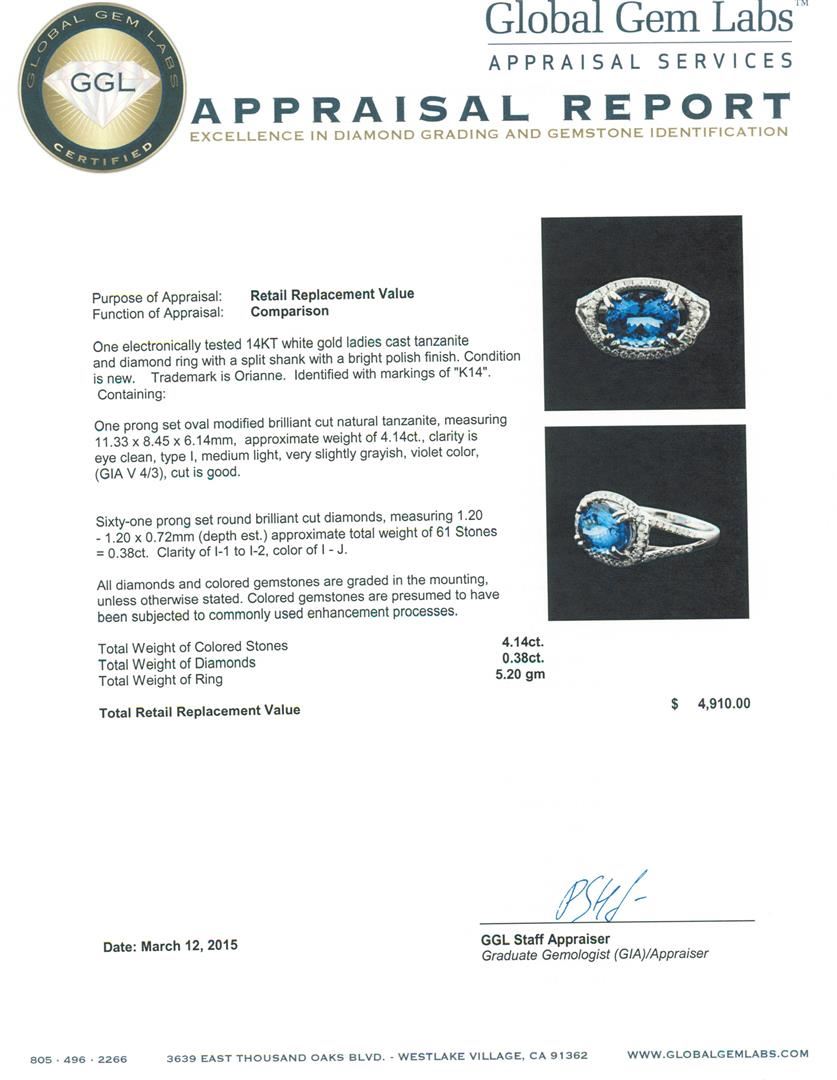 One electronically tested 14KT white gold ladies cast tanzanite and diamond ring with a split shank with a bright polish finish. Trademark is Orianne. Identified with markings of "K14". Condition is new. Containing: One prong set oval modified brilliant cut natural tanzanite, measuring 11.33 x 8.45 x 6.14mm, approximate weight of 4.14ct., clarity is eye clean, type I, medium light, very slightly grayish, violet color, (GIA V 4/3), cut is good. Sixty-One prong set round brilliant cut diamonds, measuring 1.20 - 1.20 x 0.72mm (depth est.) approximate total weight of 61 Stones = 0.38ct. Clarity: I-1 to I-2. Color: I - J. All diamonds and colored gemstones are graded in the mounting, unless otherwise stated. Colored gemstones are presumed to have been subjected to commonly used enhancement processes. Total Weight of Colored Stones 4.14ct. Total Weight of Diamonds 0.38ct. Total Weight of Ring 5.20 grams. GGL Appraised at $4,910.00.