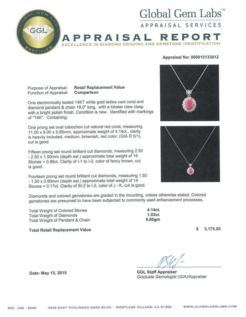 One electronically tested 14KT white gold ladies cast coral and diamond pendant & chain 18.0" long, with a lobster claw clasp with a bright polish finish. Identified with markings of "14K". Condition is new. Containing: One prong set oval cabochon cut natural red coral, measuring 11.00 x 9.00 x 5.85mm, approximate weight of 4.14ct., clarity is heavily included, medium, brownish, red color, (GIA R 5/1), cut is good. Fifteen prong set round brilliant cut diamonds, measuring 2.50 - 2.50 x 1.50mm (depth est.) approximate total weight of 15 Stones = 0.86ct. Clarity: I-1 to I-2, Cut is Good. Fourteen prong set round brilliant cut diamonds, measuring 1.50 - 1.50 x 0.90mm (depth est.) approximate total weight of 14 Stones = 0.17ct. Clarity: SI-2 to I-2. Color: J - K, Cut is Good. Diamonds and colored gemstones are graded in the mounting, unless otherwise stated. Colored gemstones are presumed to have been subjected to commonly used enhancement processes. Total Weight of Colored Stones 4.14ct. Total Weight of Diamonds 1.03ct. Total Weight of Pendant & Chain 6.80 grams. GGL Appraised at $3,175.00.