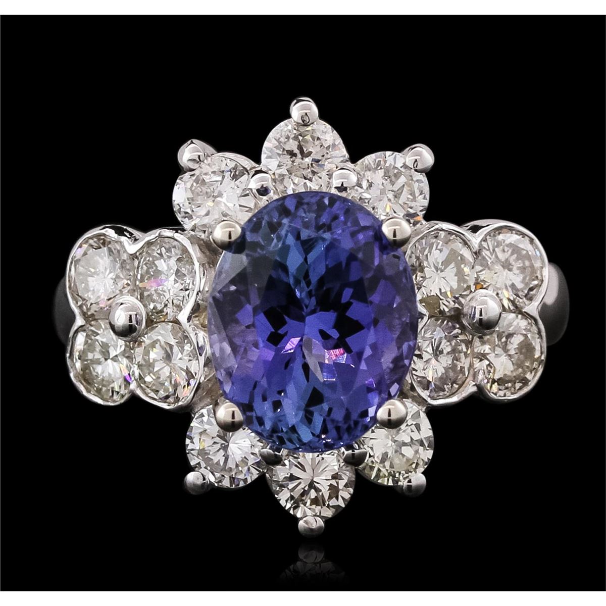 One electronically tested 14KT white gold ladies combination cast & assembled tanzanite and diamond ring with a flat shank with a bright polish finish. Identified with markings of "14K". Condition is new. Containing: One prong set oval modified brilliant cut natural tanzanite, measuring 10.35 x 8.45 x 7.00mm, approximate weight of 4.14ct., clarity is eye clean, type I, medium, very slightly grayish, violet color, (GIA V 5/3), cut is good. Fourteen prong set round brilliant cut diamonds, measuring 3.20 - 3.20 x 1.92mm (depth est.) approximate total weight of 14 Stones = 1.68ct. Clarity: SI-1 to I-1. Color: I - K, Cut is Good. Colored gemstones are presumed to have been subjected to commonly used enhancement processes. All diamonds and colored gemstones are graded in the mounting, unless otherwise stated. Total Weight of Colored Stones 4.14ct. Total Weight of Diamonds 1.68ct. Total Weight of Ring 7.20 grams. GGL Appraised at $12,065.00.