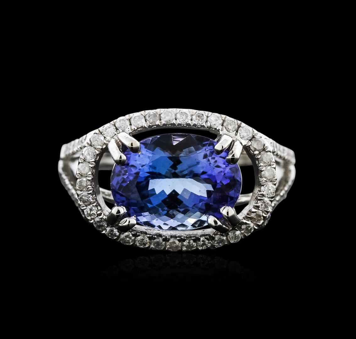 One electronically tested 14KT white gold ladies cast tanzanite and diamond ring with a split shank with a bright polish finish. Trademark is Orianne. Identified with markings of "K14". Condition is new. Containing: One prong set oval modified brilliant cut natural tanzanite, measuring 11.33 x 8.45 x 6.14mm, approximate weight of 4.14ct., clarity is eye clean, type I, medium light, very slightly grayish, violet color, (GIA V 4/3), cut is good. Sixty-One prong set round brilliant cut diamonds, measuring 1.20 - 1.20 x 0.72mm (depth est.) approximate total weight of 61 Stones = 0.38ct. Clarity: I-1 to I-2. Color: I - J. All diamonds and colored gemstones are graded in the mounting, unless otherwise stated. Colored gemstones are presumed to have been subjected to commonly used enhancement processes. Total Weight of Colored Stones 4.14ct. Total Weight of Diamonds 0.38ct. Total Weight of Ring 5.20 grams. GGL Appraised at $4,910.00.
