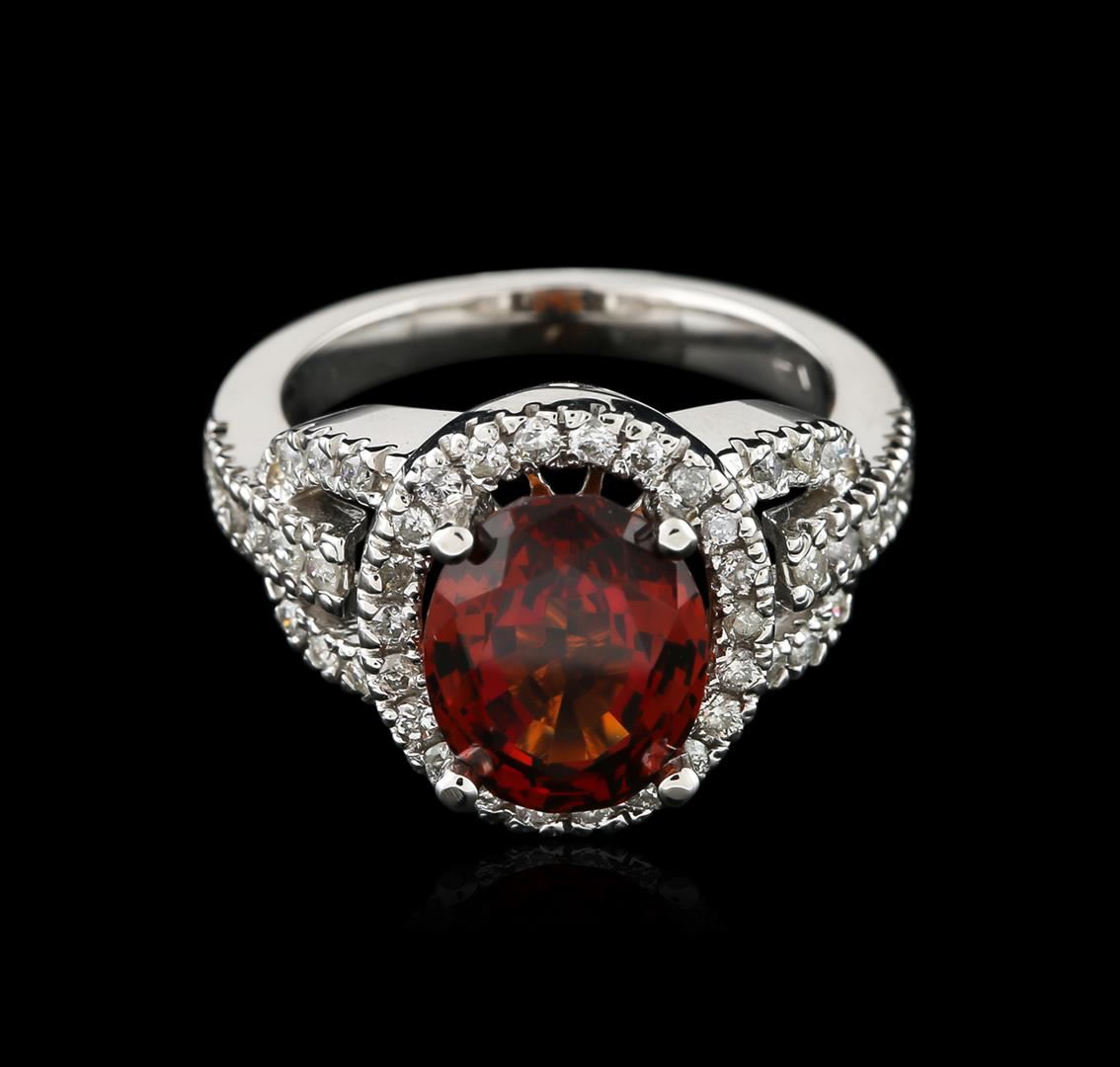 One electronically tested 14KT white gold ladies cast garnet and diamond ring with a bright polish finish. Identified with markings of "K14". Condition is new. Containing: One prong set oval modified brilliant cut natural almandite garnet, measuring 10.37 x 8.44 x 5.57mm, approximate weight of 4.15ct., clarity is eye clean, type II, medium, slightly brownish, reddish orange color, (GIA rO 5/2), cut is very good. Forty-Six prong set round brilliant cut diamonds, measuring 1.50 - 1.50 x 0.90mm (depth est.) approximate total weight of 46 Stones = 0.57ct. Clarity: SI-2 to I-2. Color: H - I, Cut is Good. All diamonds and colored gemstones are graded in the mounting, unless otherwise stated. Colored gemstones are presumed to have been subjected to commonly used enhancement processes. Total Weight of Colored Stones 4.15ct. Total Weight of Diamonds 0.57ct. Total Weight of Ring 6.90 grams. GGL Appraised at $3,405.00.