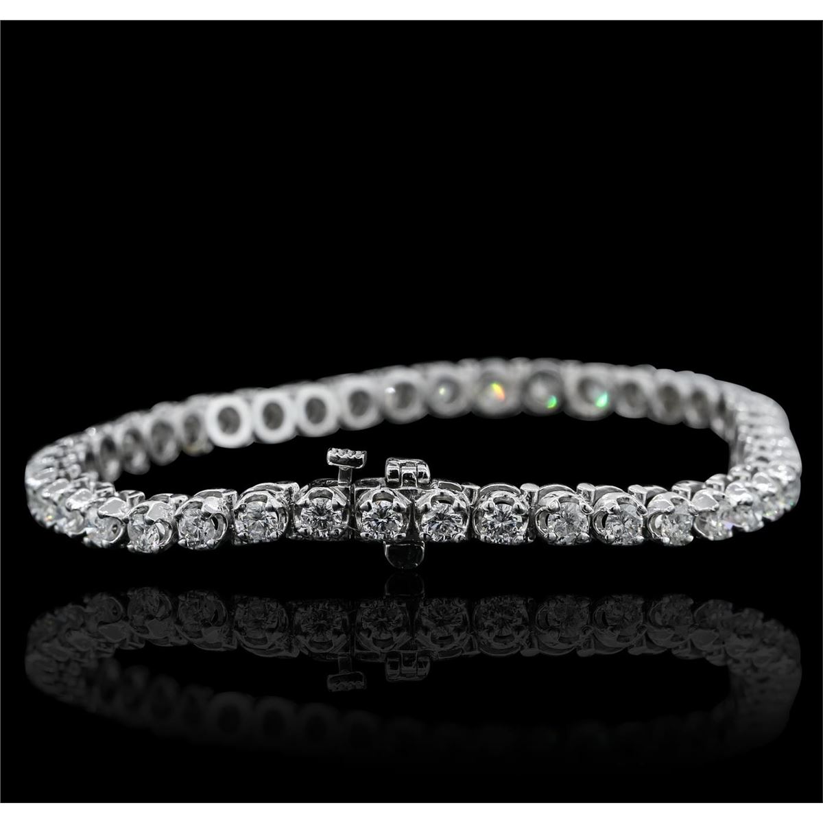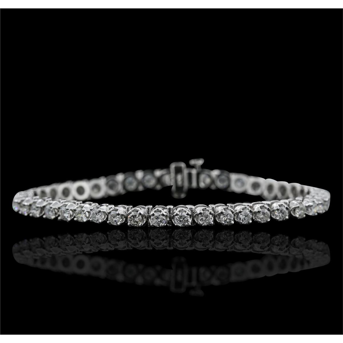 One electronically tested 14KT white gold ladies combination cast & assembled tennis bracelet with a hidden box clasp with a bright polish finish. Condition is new. Measurements: 7" in length. Identified with markings of "14K". Containing: Forty-Two prong set round brilliant cut diamonds, measuring 3.00 - 3.00 x 1.80mm (depth est.) approximate total weight of 42 Stones = 4.15ct. Clarity: SI-2 to I-2. Color: H - J, Cut is Good. All diamonds are graded in the mounting, unless otherwise stated. Total Weight of Diamonds 4.15ct. Total Weight of Bracelet 14.10 grams. GGL Appraised at $14,935.00.