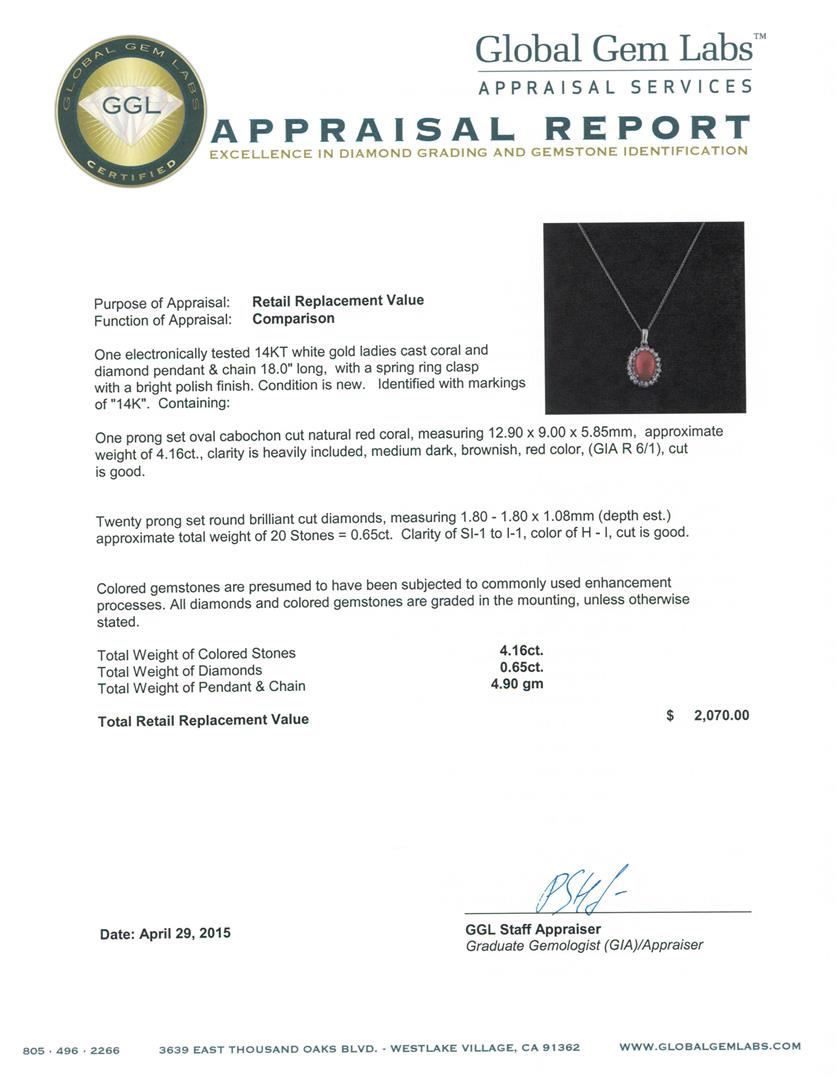 One electronically tested 14KT white gold ladies cast coral and diamond pendant & chain 18.0" long, with a spring ring clasp with a bright polish finish. Identified with markings of "14K". Condition is new. Containing: One prong set oval cabochon cut natural red coral, measuring 12.90 x 9.00 x 5.85mm, approximate weight of 4.16ct., clarity is heavily included, medium dark, brownish, red color, (GIA R 6/1), cut is good. Twenty prong set round brilliant cut diamonds, measuring 1.80 - 1.80 x 1.08mm (depth est.) approximate total weight of 20 Stones = 0.65ct. Clarity: SI-1 to I-1. Color: H - I, Cut is Good. Colored gemstones are presumed to have been subjected to commonly used enhancement processes. All diamonds and colored gemstones are graded in the mounting, unless otherwise stated. Total Weight of Colored Stones 4.16ct. Total Weight of Diamonds 0.65ct. Total Weight of Pendant & Chain 4.90 grams. GGL Appraised at $2,070.00.