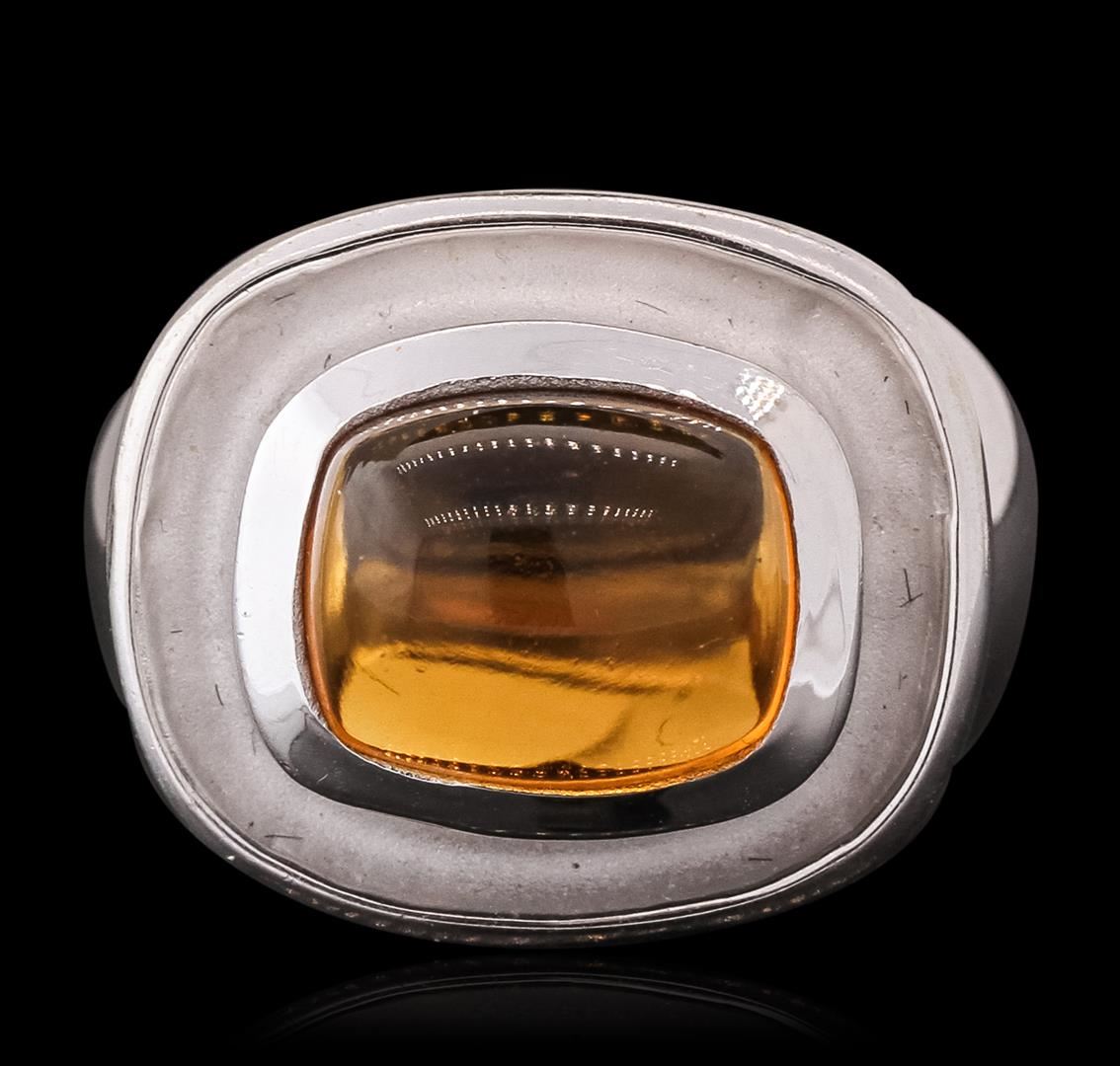 One electronically tested 14KT white gold ladies combination cast & assembled ring with a bright polish finish. Identified with markings of "14K". Condition is new. Containing: One bezel set rectangular cabochon cut natural citrine quartz, measuring 11.00 x 9.00 x 5.85mm, approximate weight of 4.16ct., clarity is eye clean, type I, medium light, moderately strong, yellowish orange color, (GIA yO 4/4), cut is good. Colored gemstones are presumed to have been subjected to commonly used enhancement processes. All colored gemstones are graded in the mounting, unless otherwise stated. Total Weight of Colored Stones 4.16ct. Total Weight of Ring 15.00 grams. GGL Appraised at $2,780.00.