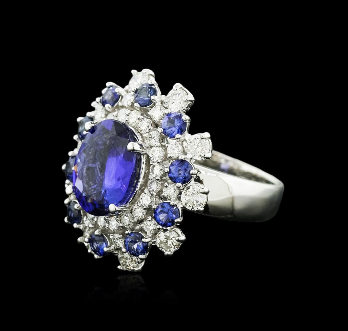 One electronically tested 14KT white gold ladies cast tanzanite, sapphire and diamond ring with a bright polish finish. Identified with markings of "14K". Condition is new. Containing: One prong set oval modified brilliant cut natural tanzanite, measuring 11.50 x 8.90 x 5.79mm, approximate weight of 4.17ct., clarity is eye clean, type I, medium, moderately strong, violetish blue color, (GIA vB 5/4), cut is good. Ten prong set round modified brilliant cut natural blue sapphires, measuring 3.50 - 3.50 x 2.28 mm, approximate total weight of 2.20ct., clarity is moderately included, type II, medium, moderately strong, blue color, (GIA B 5/4), cut is good. Ten prong set round brilliant cut diamonds, measuring 3.20 - 3.20 x 1.92mm (depth est.) approximate total weight of 10 Stones = 1.20ct. Clarity: SI-2 to I-1. Color: J - K, Cut is Good. Thirty-Two prong set round brilliant cut diamonds, measuring 1.70 - 1.70 x 1.02mm (depth est.) approximate total weight of 32 Stones = 0.57ct. Clarity: SI-1 to SI-2. Color: J - K, Cut is Good. Colored gemstones are presumed to have been subjected to commonly used enhancement processes. All diamonds and colored gemstones are graded in the mounting, unless otherwise stated. Total Weight of Colored Stones 6.37ct. Total Weight of Diamonds 1.77ct. Total Weight of Ring 11.30 grams. GGL Appraised at $8,300.00.